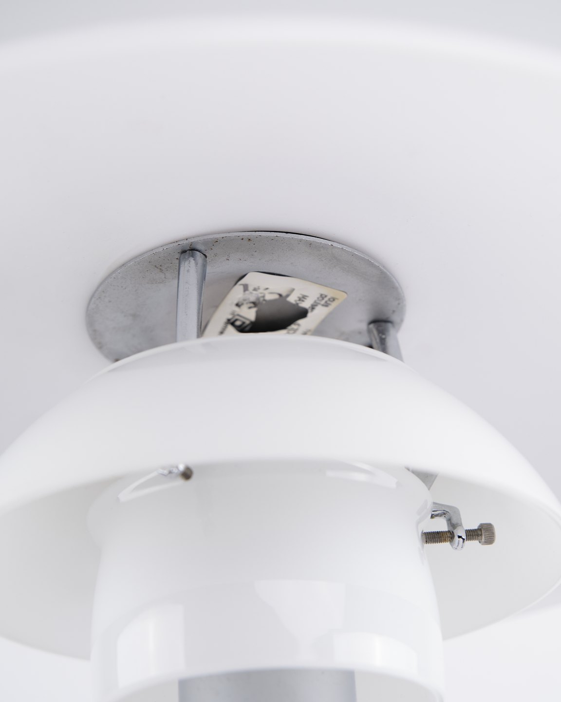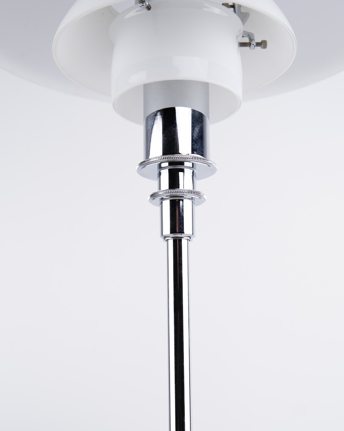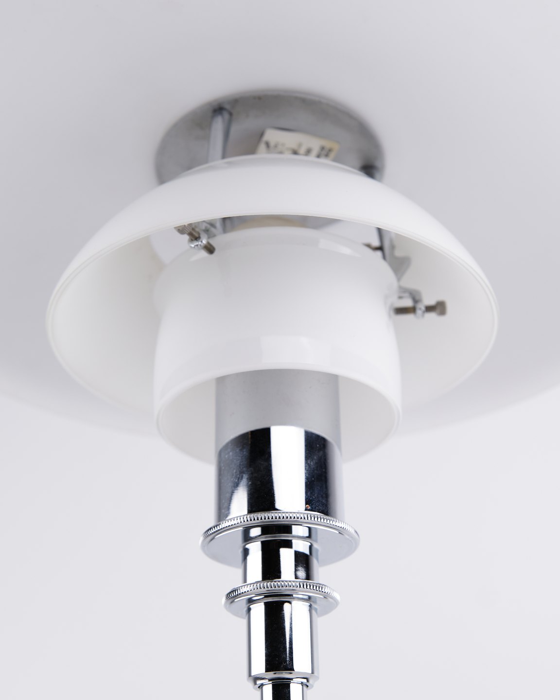 Beskrivelse: PH 3/2 bordlampe designet af Poul Henningsen og fremstillet af Louis Poulsen. Lampen er udført med skærme i hvidt opalglas, som sikrer et blødt og blændfrit lys. Det ikoniske treskærmssystem er udviklet for optimal lysfordeling og er et centralt element i Henningsens designfilosofi.