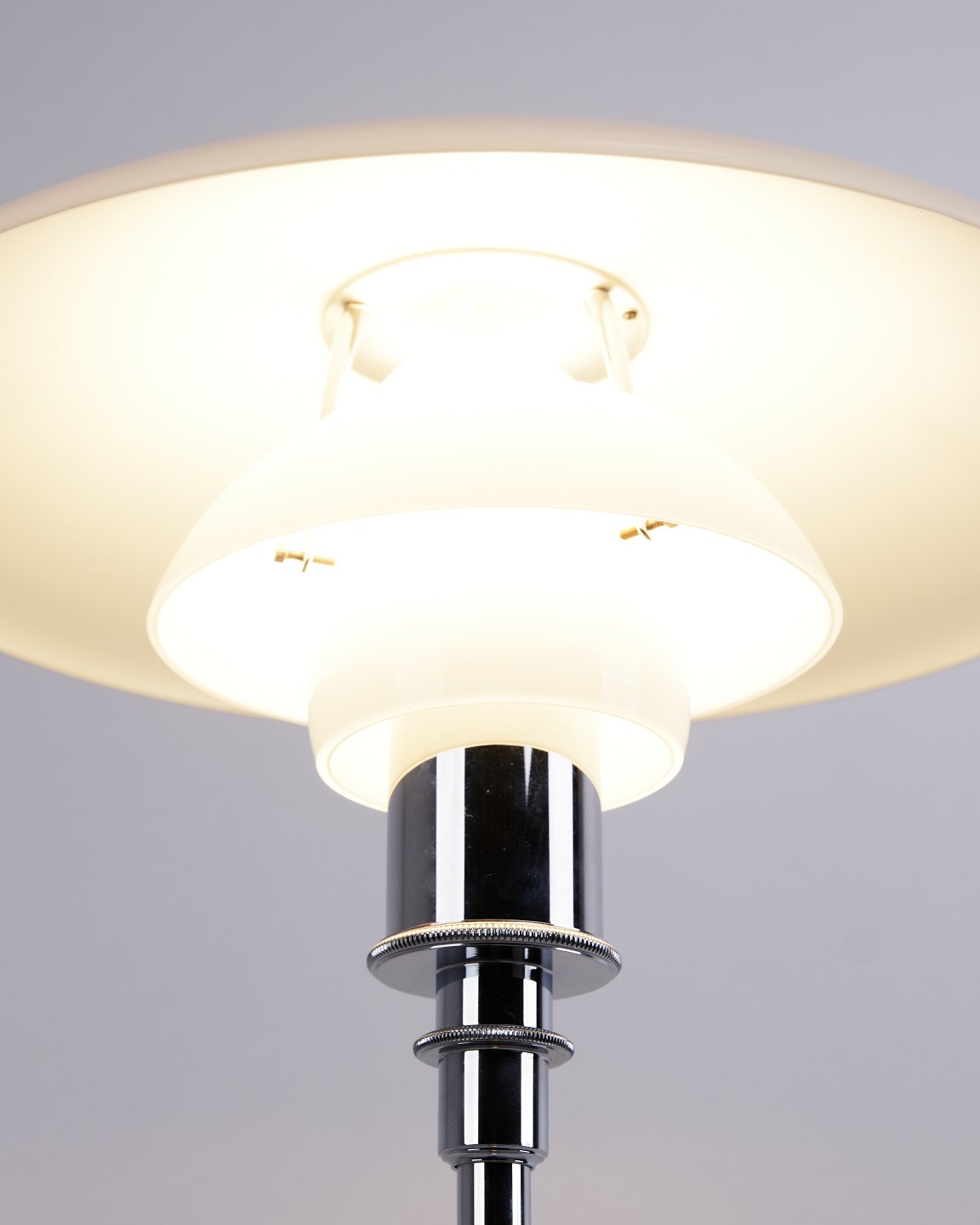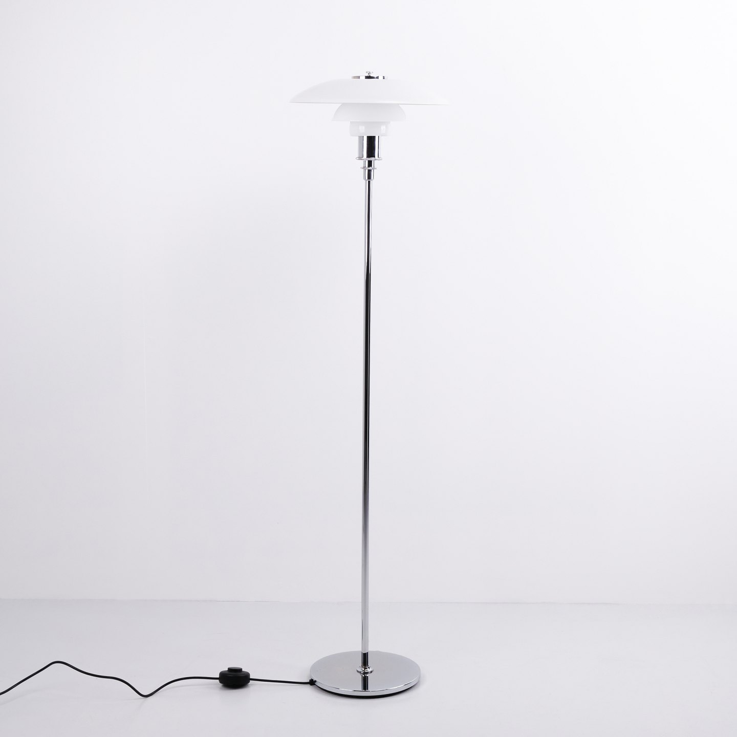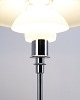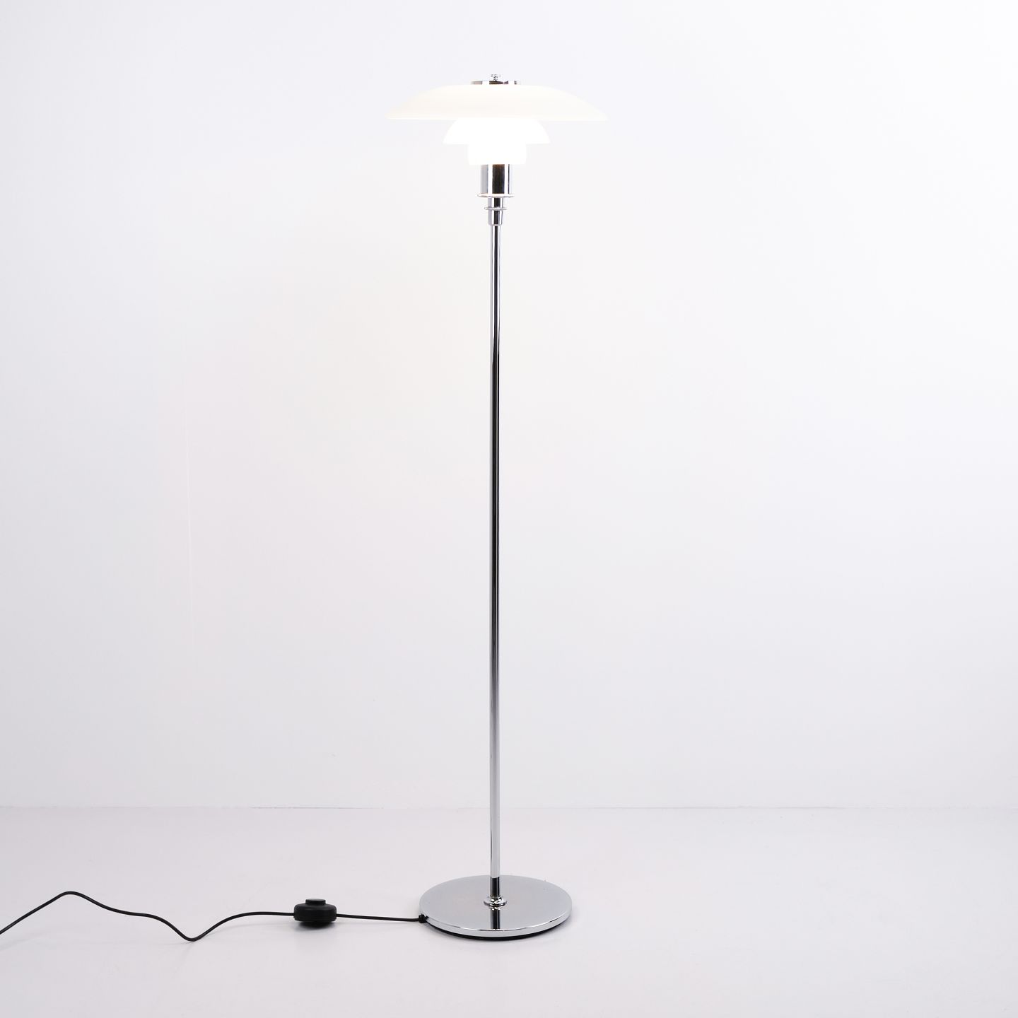 Description: PH 3½-2½ floor lamp in chrome with opal glass from Louis Poulsen. Designed by Poul Henningsen with classic Danish lighting design and an elegant expression.