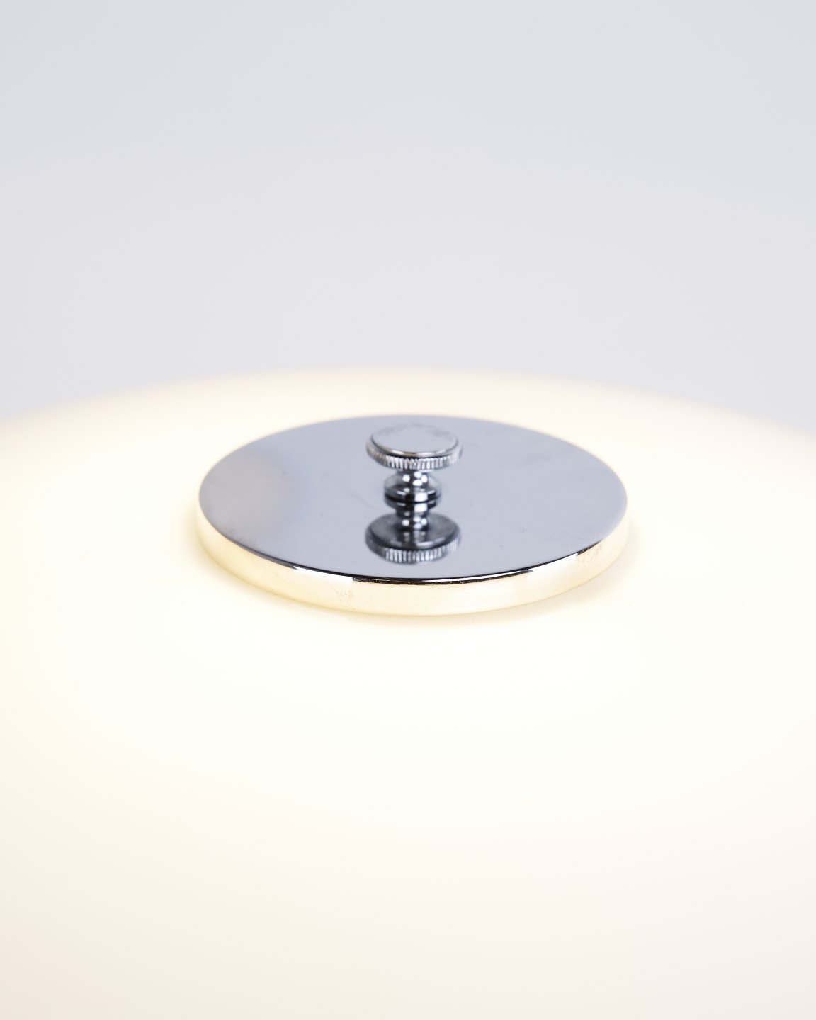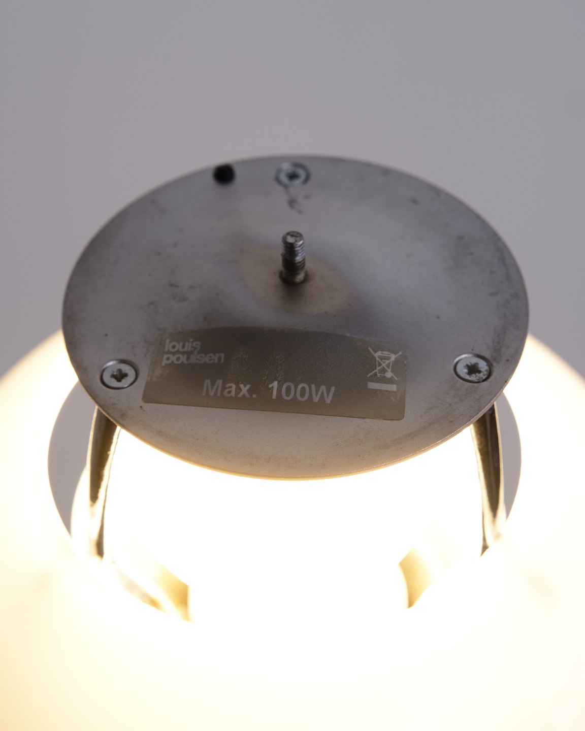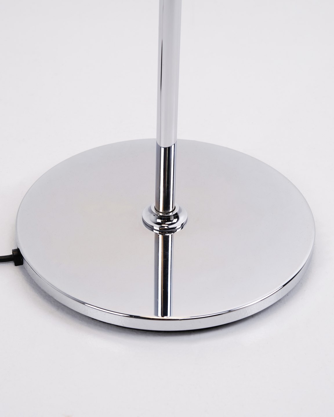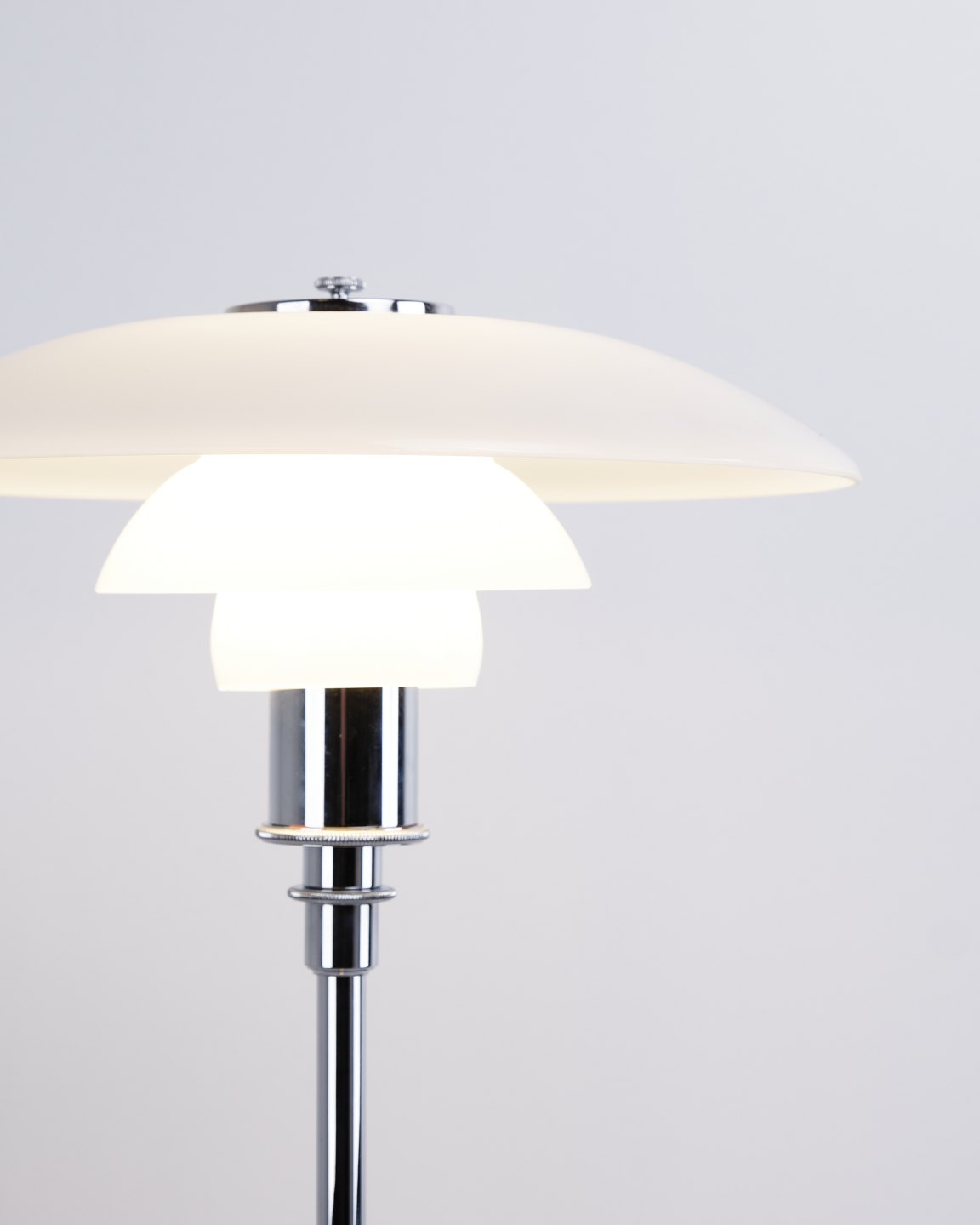 Description: PH 3½-2½ floor lamp in chrome with opal glass from Louis Poulsen. Designed by Poul Henningsen with classic Danish lighting design and an elegant expression.