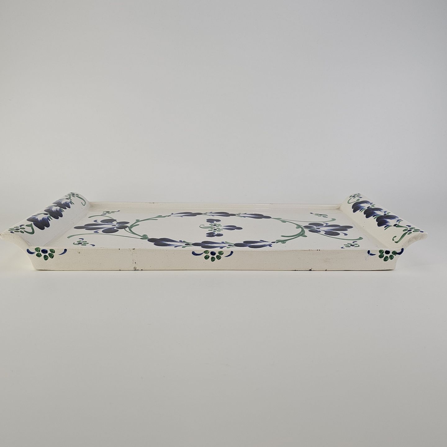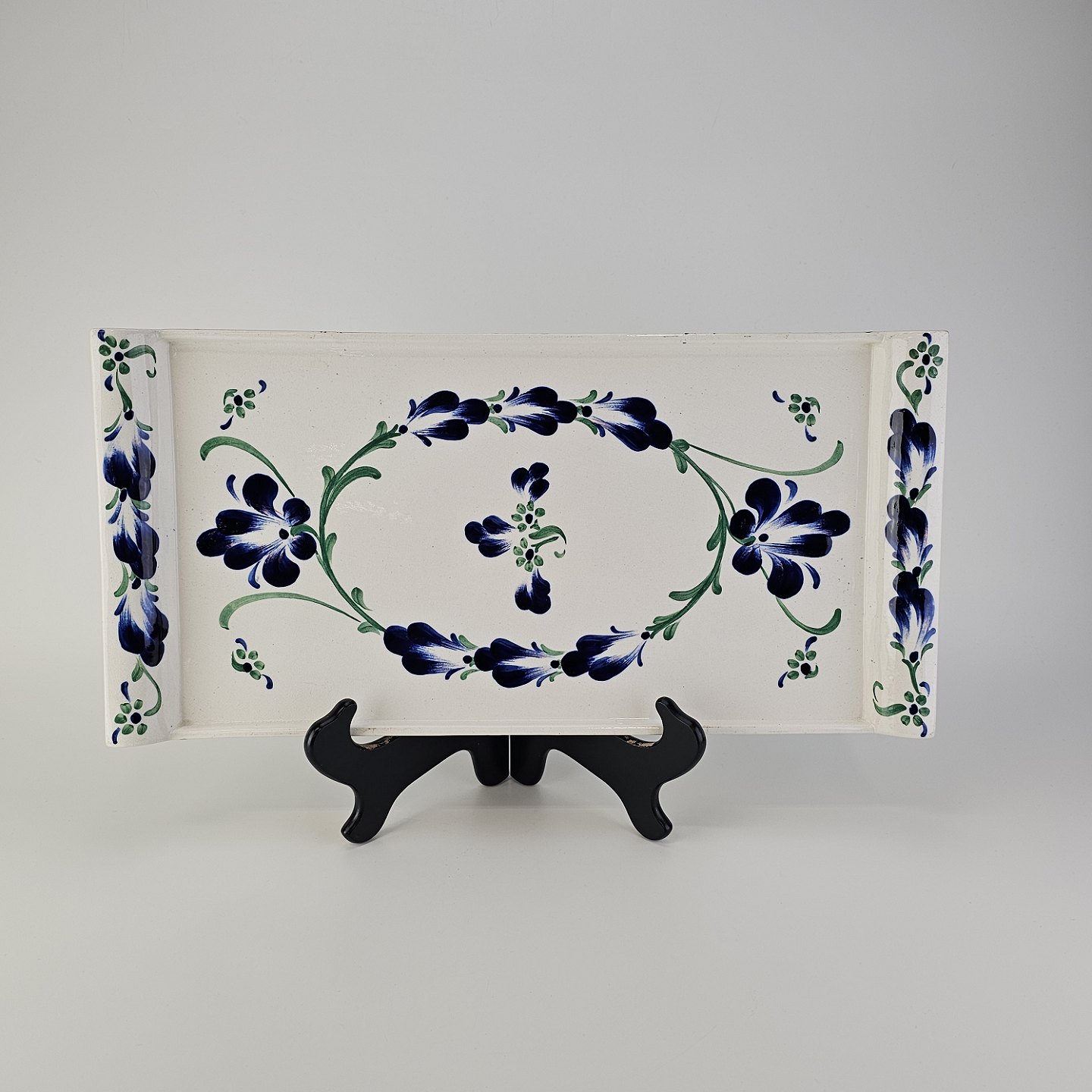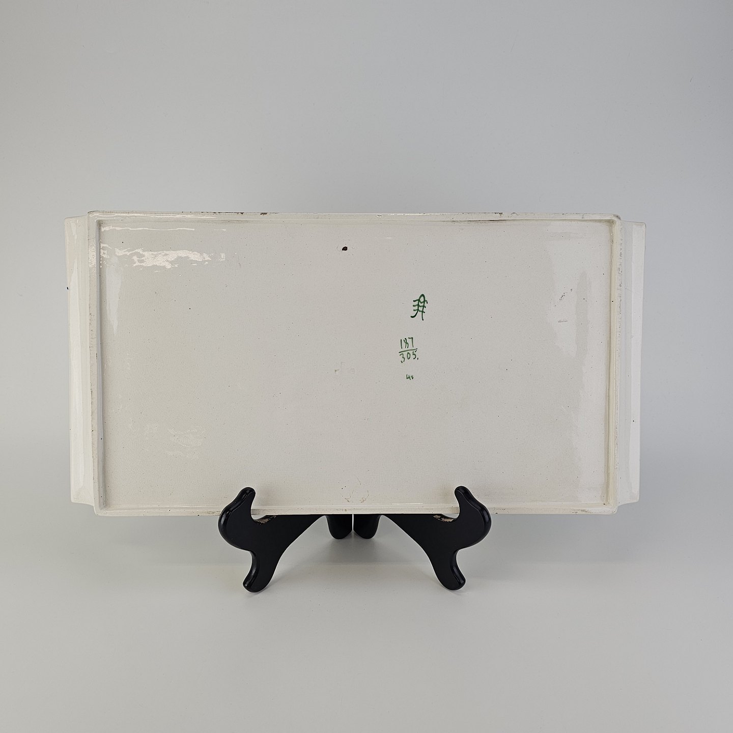Beskrivelse: Rektangulært fad i hvid fajance fra stellet Blå Cenerarier