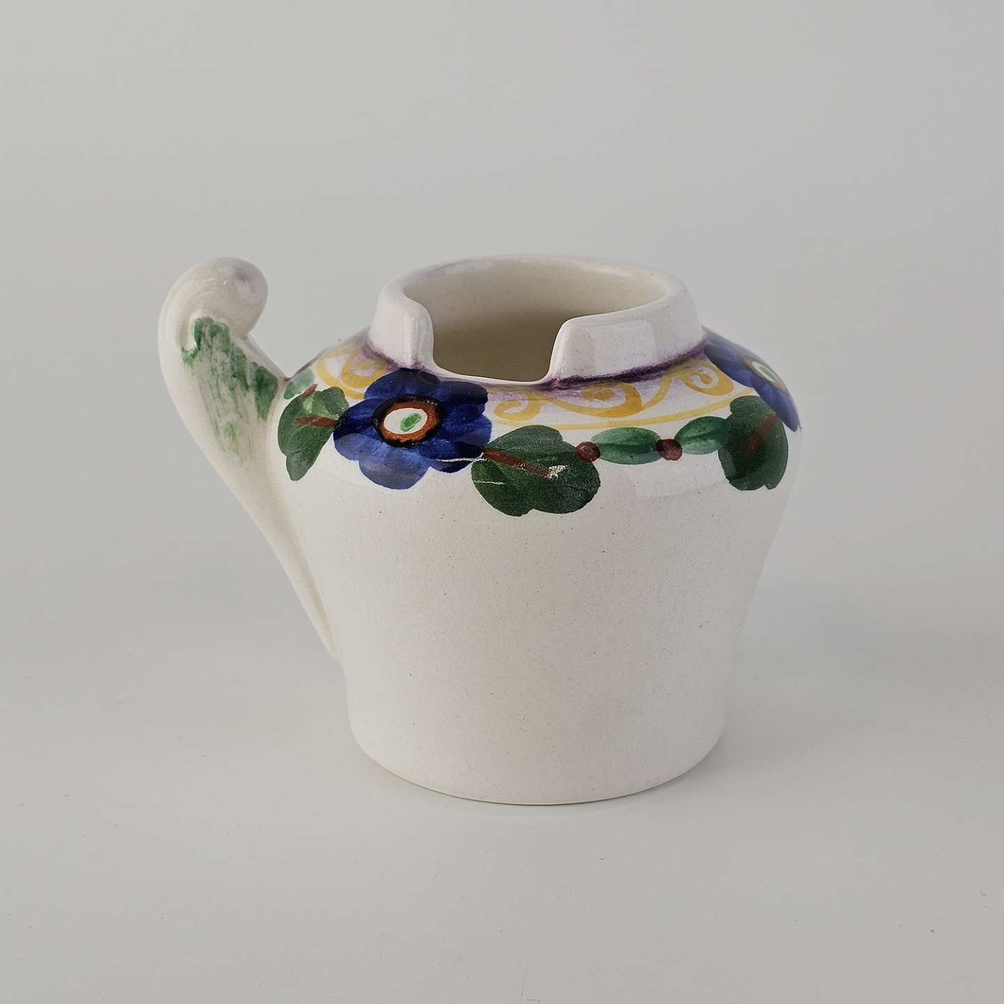 Beskrivelse: Sennepskrukke i fajance fra stellet Viol III