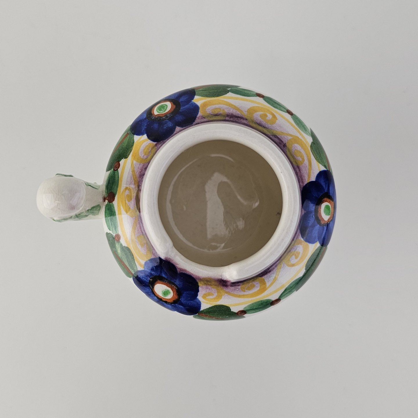 Stellet er i hvid fajance og håndmalet med dekoration af blå violer