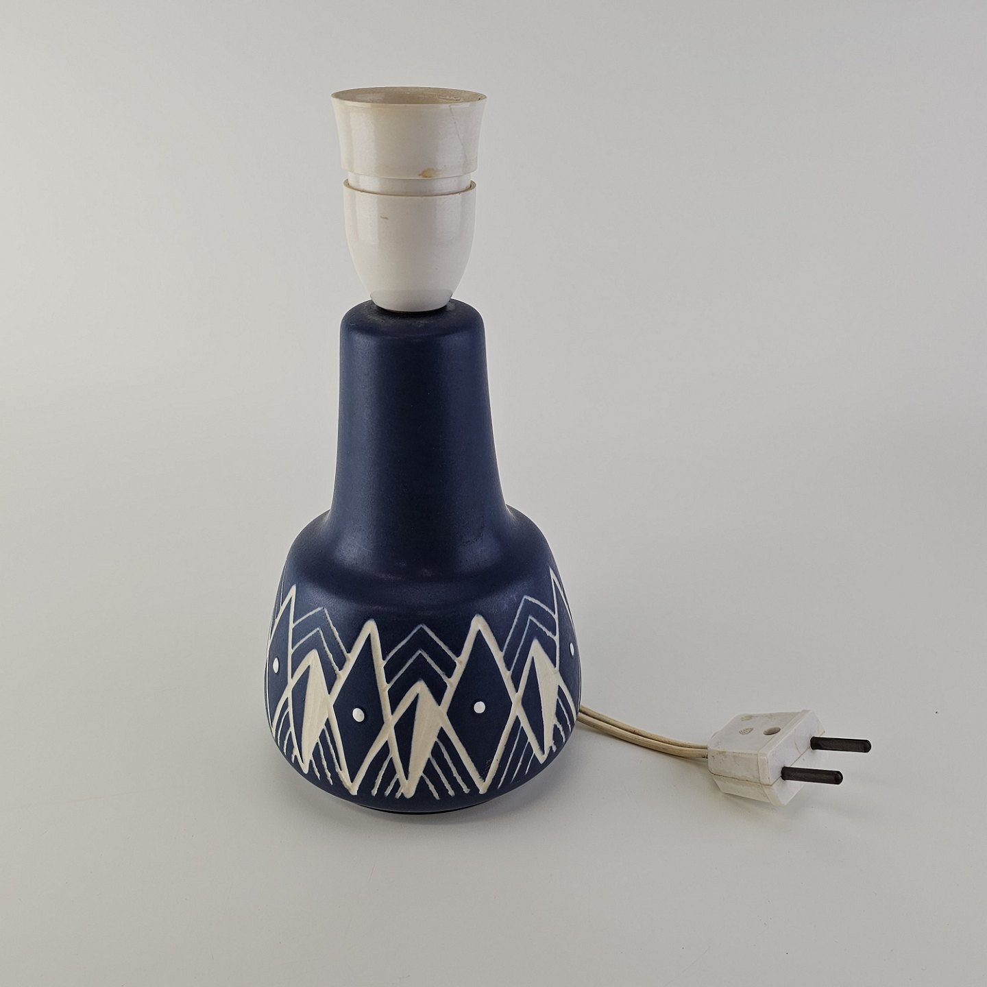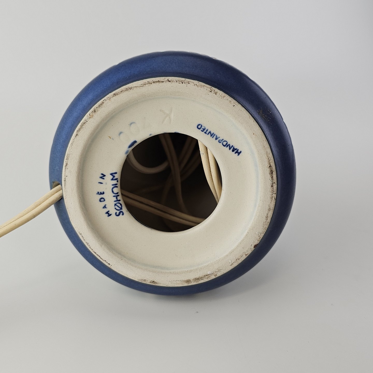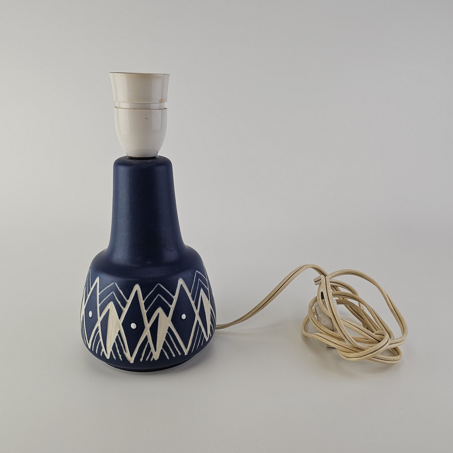 Beskrivelse: Lampefod i keramik med blå og hvid håndmalet dekoration