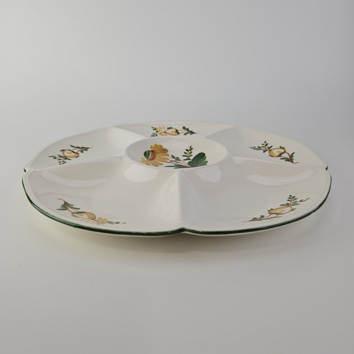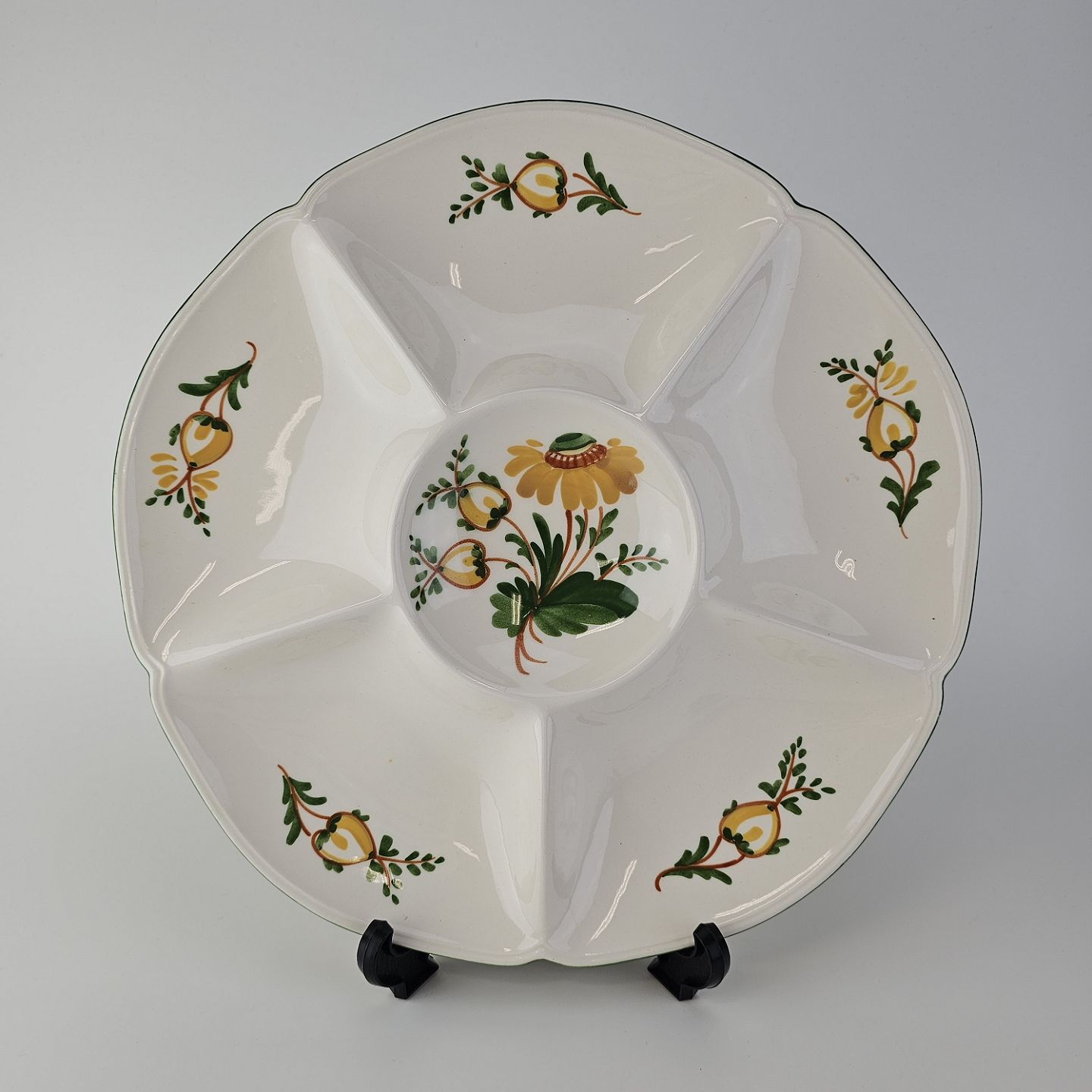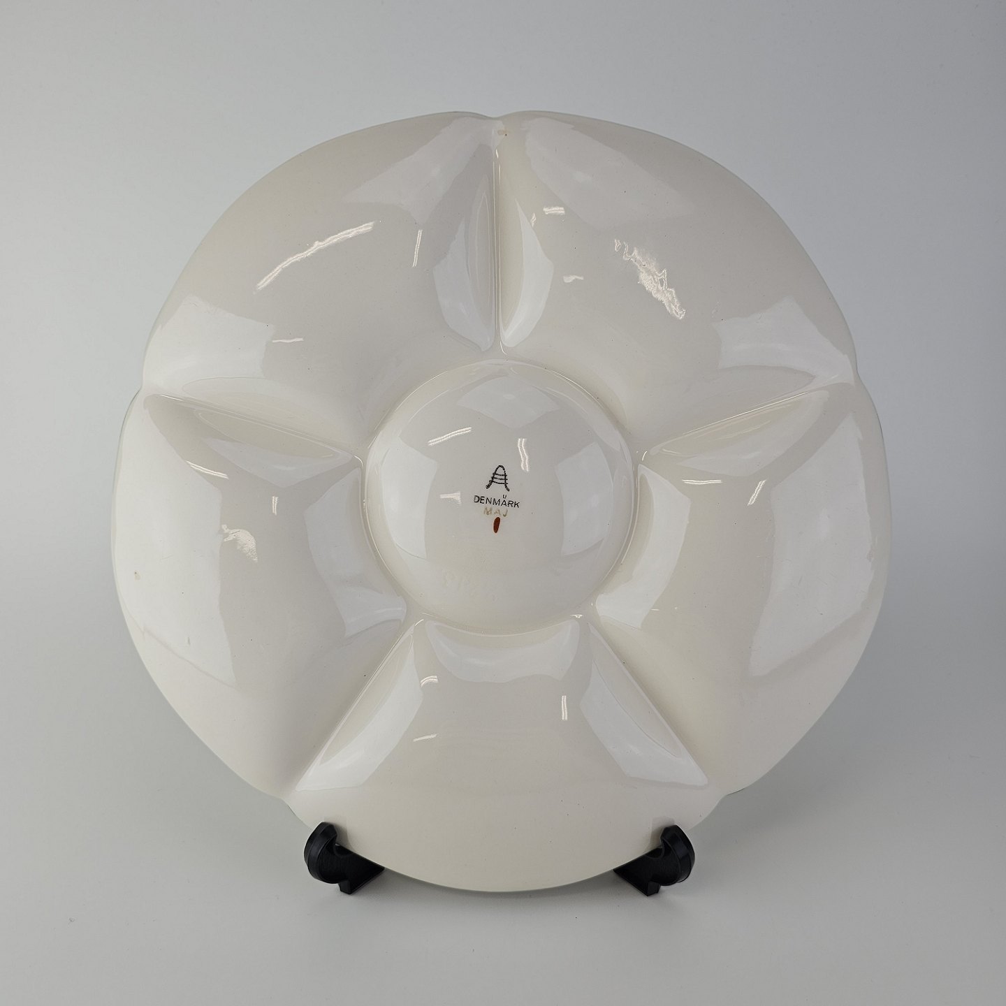 Beskrivelse: Rundt fad i fajance fra stellet Maj fremstillet i perioden 1941-1966.