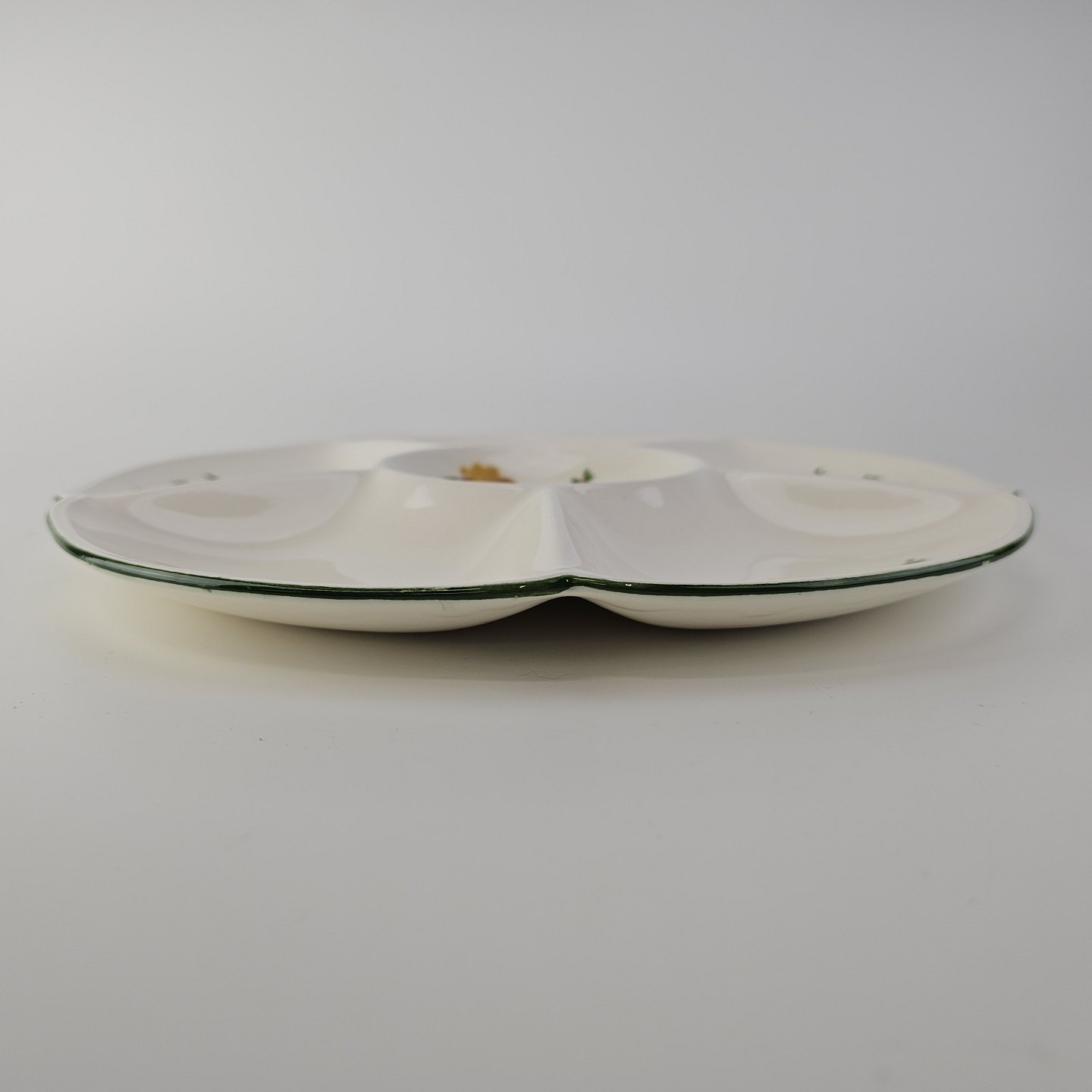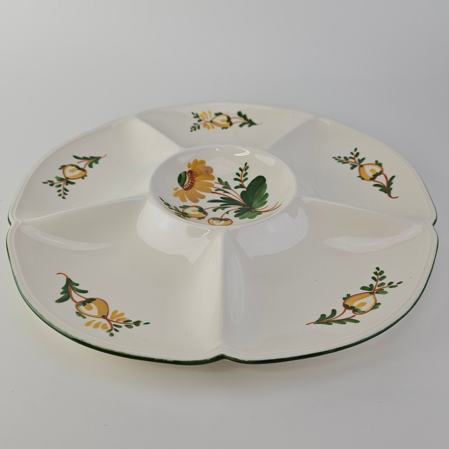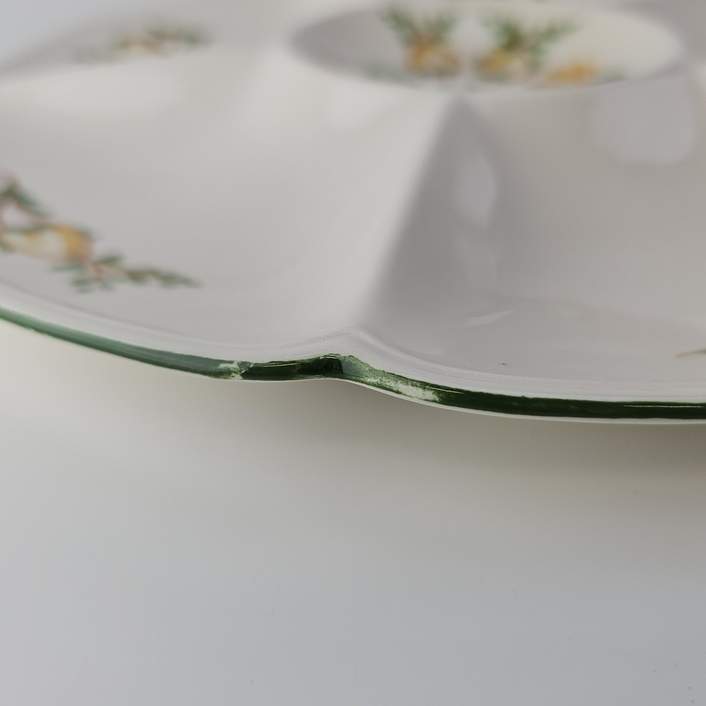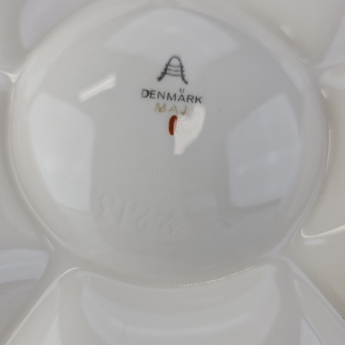 Beskrivelse: Rundt fad i fajance fra stellet Maj fremstillet i perioden 1941-1966.