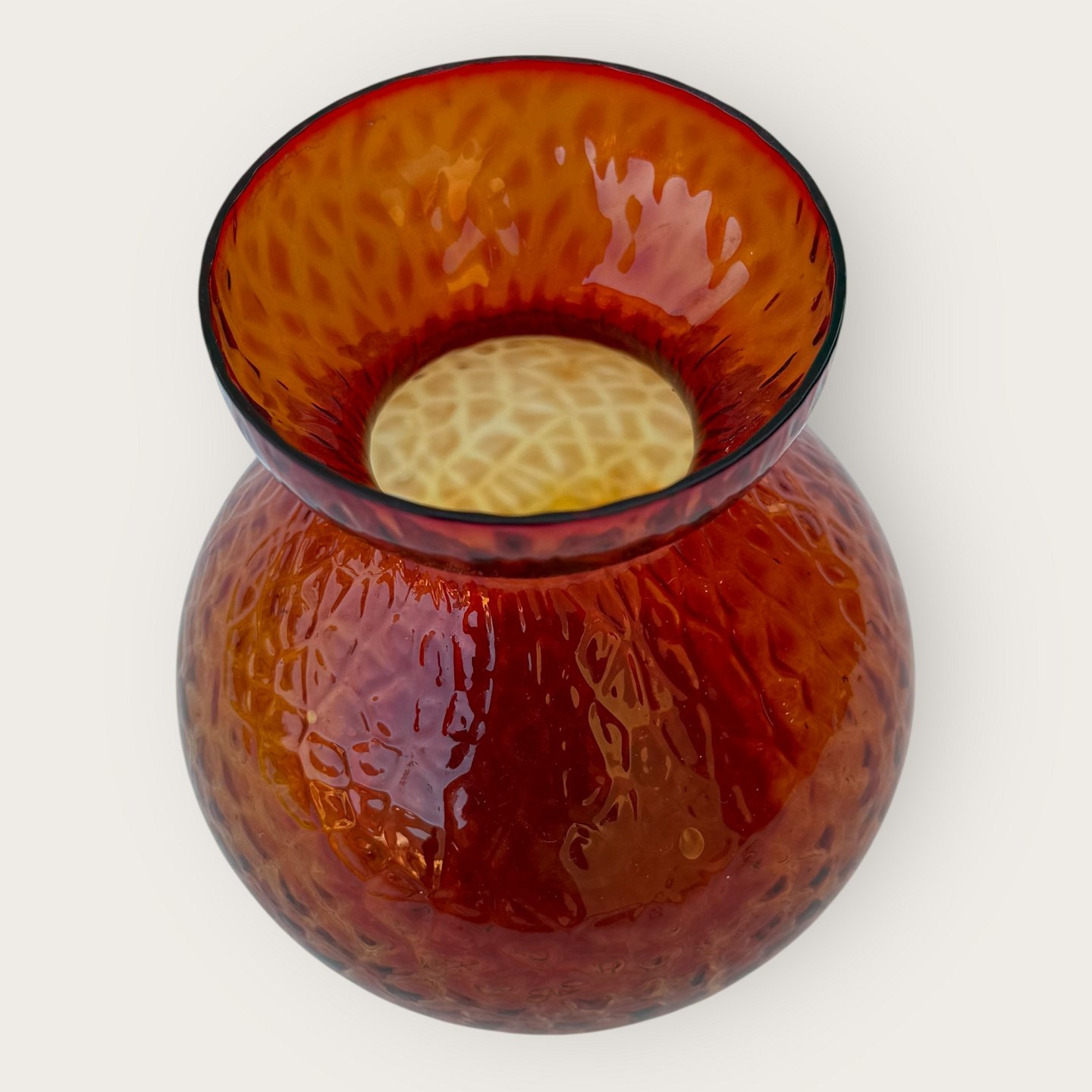 Beskrivelse: Hyacintglas, Fyens glasværk, Rødt, Med ru overflade, 10cm i diameter, 11cm høj *Pæn stand*