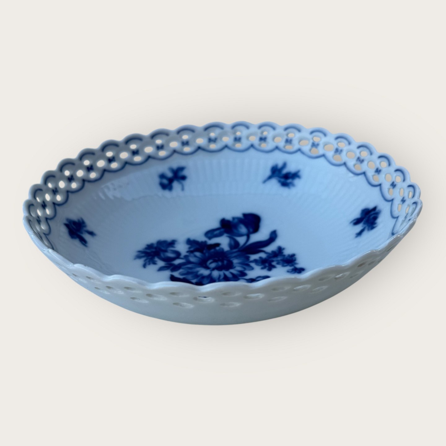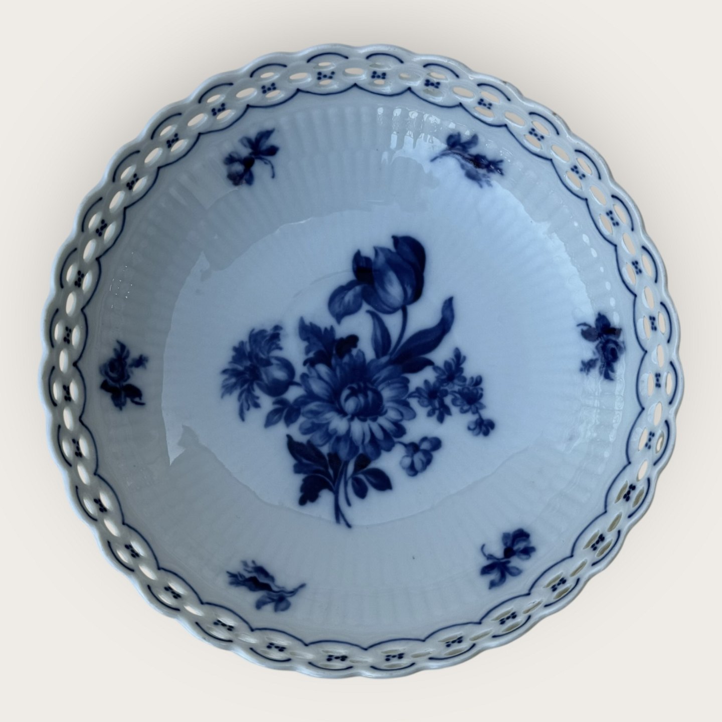 Description: Schumann, Deutschland, Schale mit durchbrochenem Rand (netzartig) mit blauem Blumendekor, Durchmesser 21 cm, Höhe 6 cm *sehr guter Zustand*