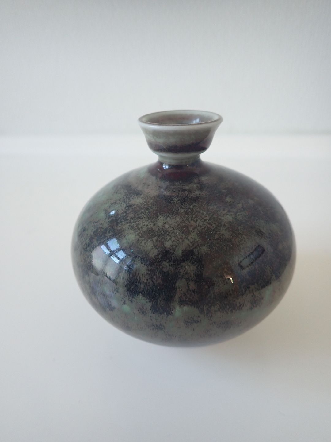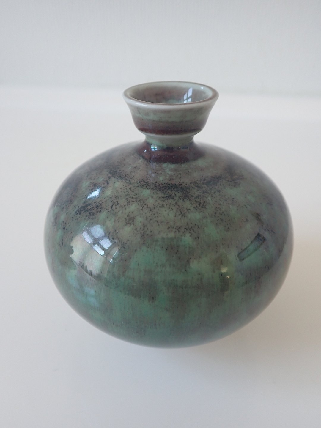 Beskrivelse: Berndt Friberg (1899 - 1981 )- Lille, buttet vase i stentøj med lille krave med blank grøn/brun/sort spættet glasur. Stemblet Friberg 77, Studio-hånd fra Gustavsberg. Højde: 8,7 cm. Bredde: ca. 7,5 cm. I fin stand.