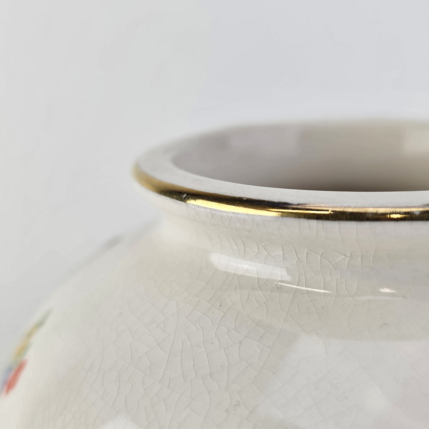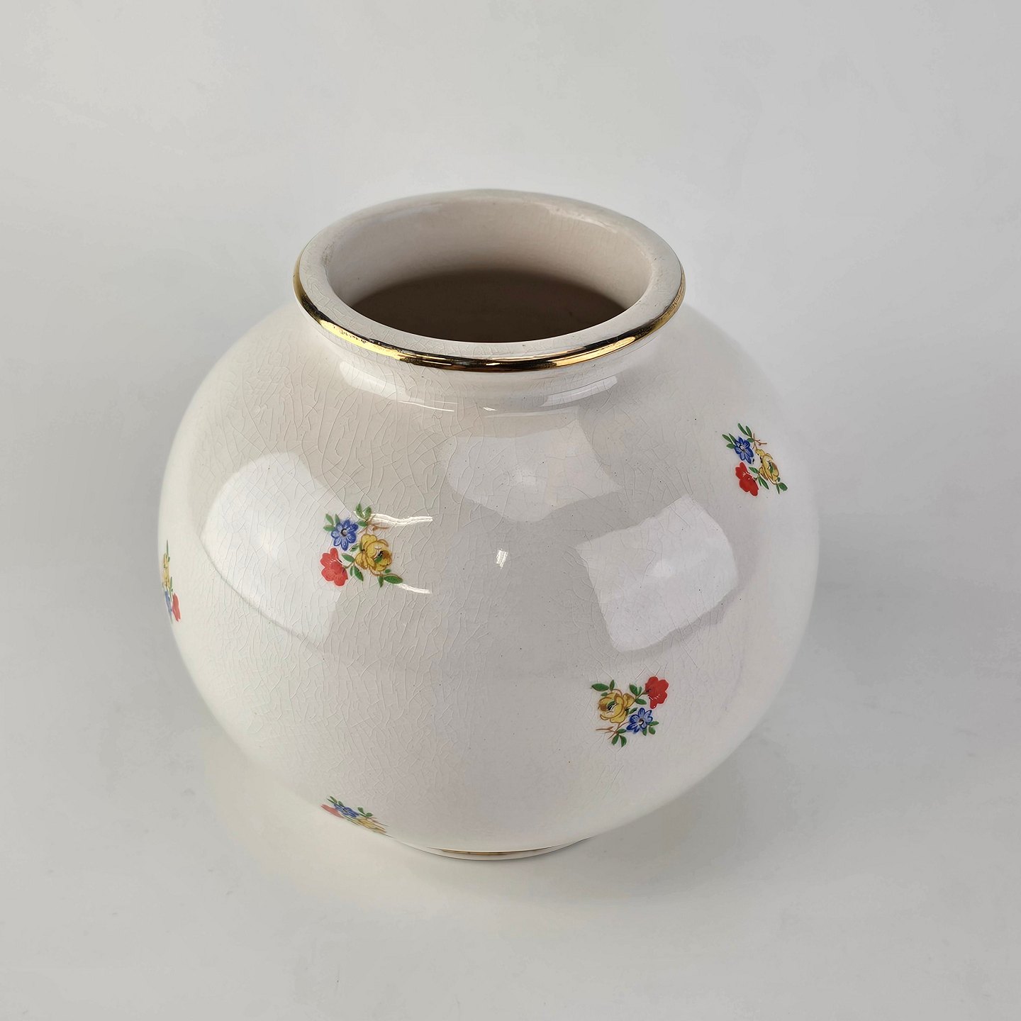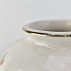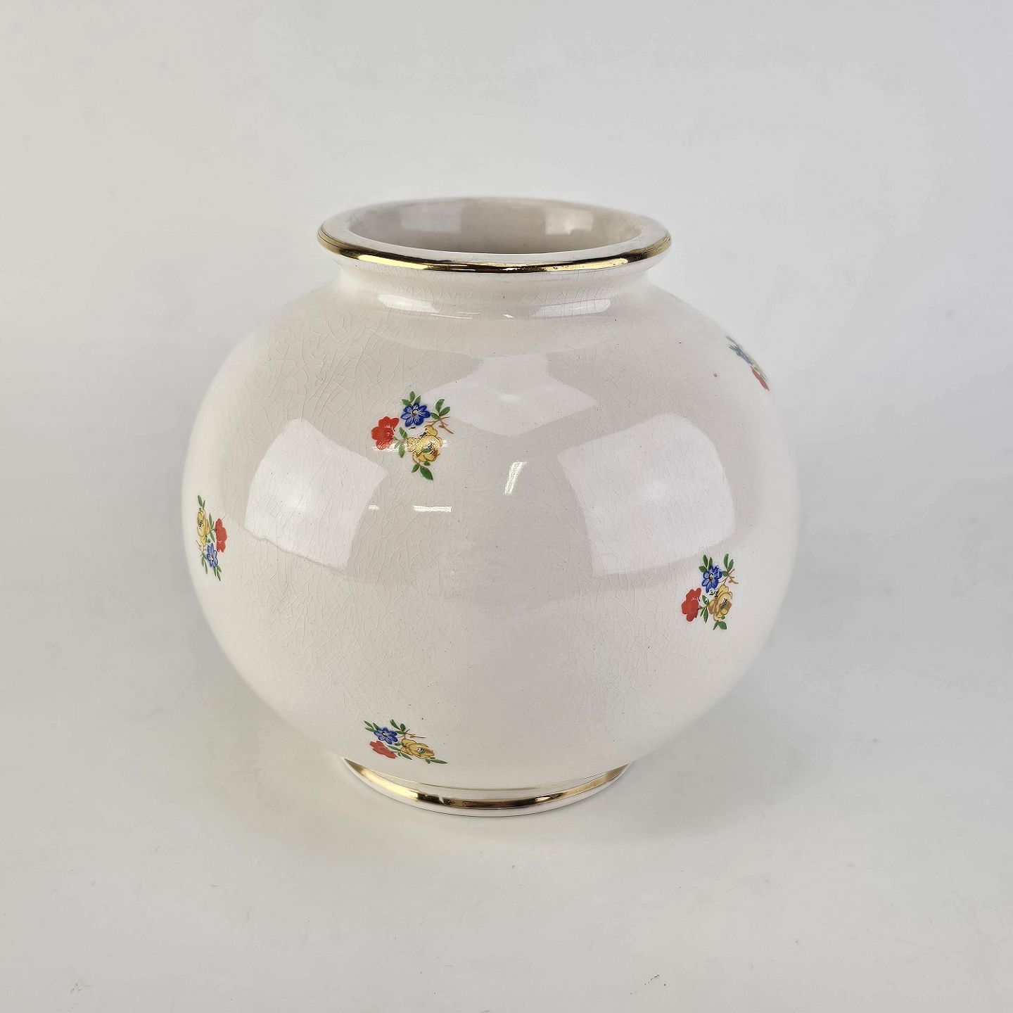 Beskrivelse: Rund vase i hvid fajance med blomsterdekoration og guldkant