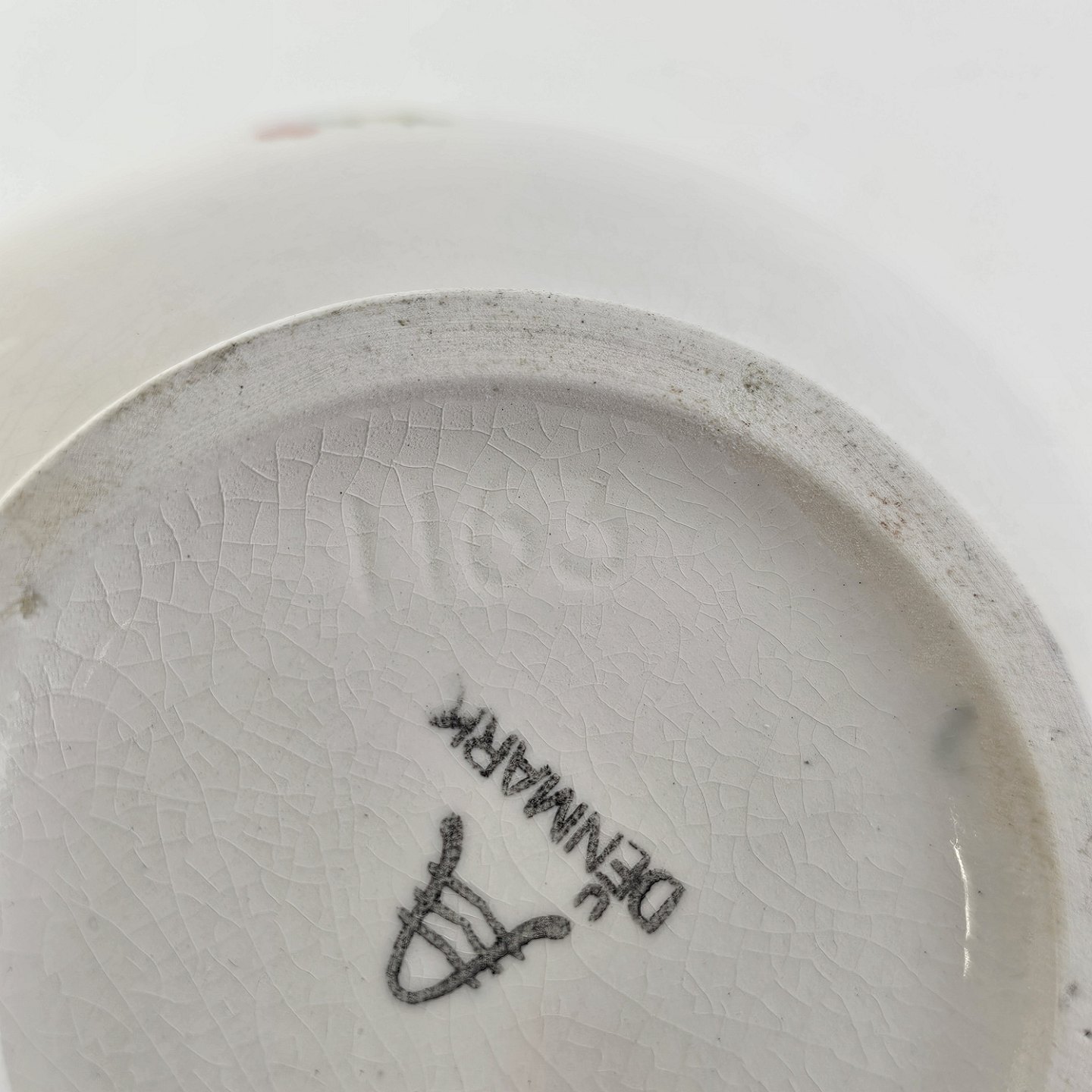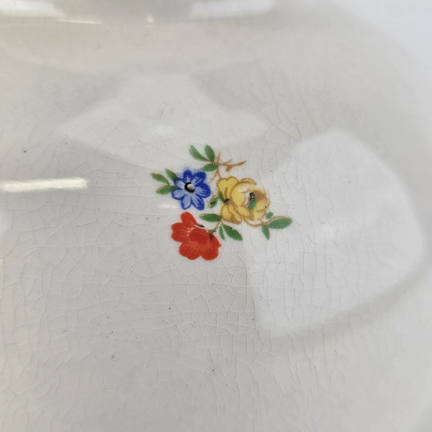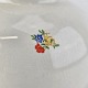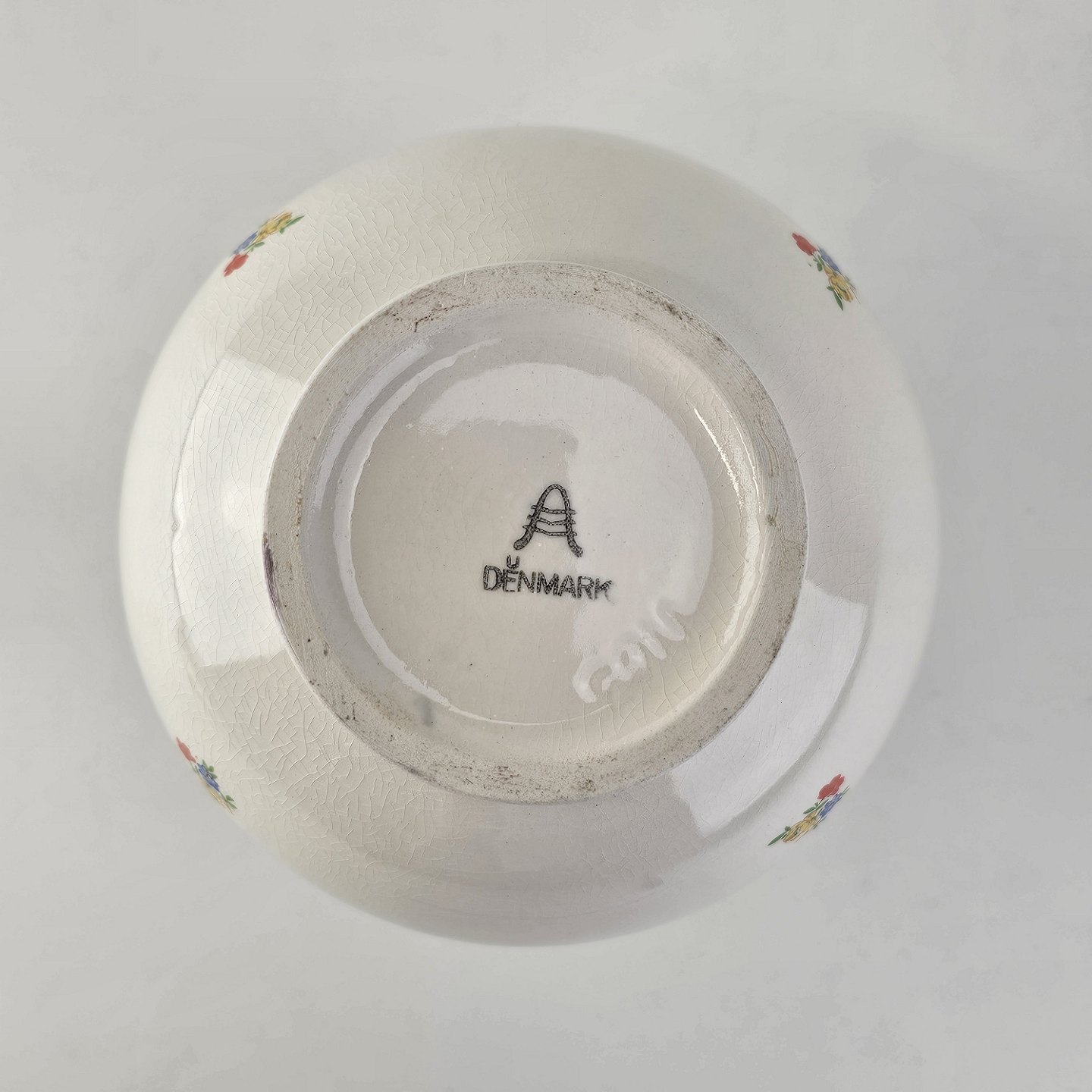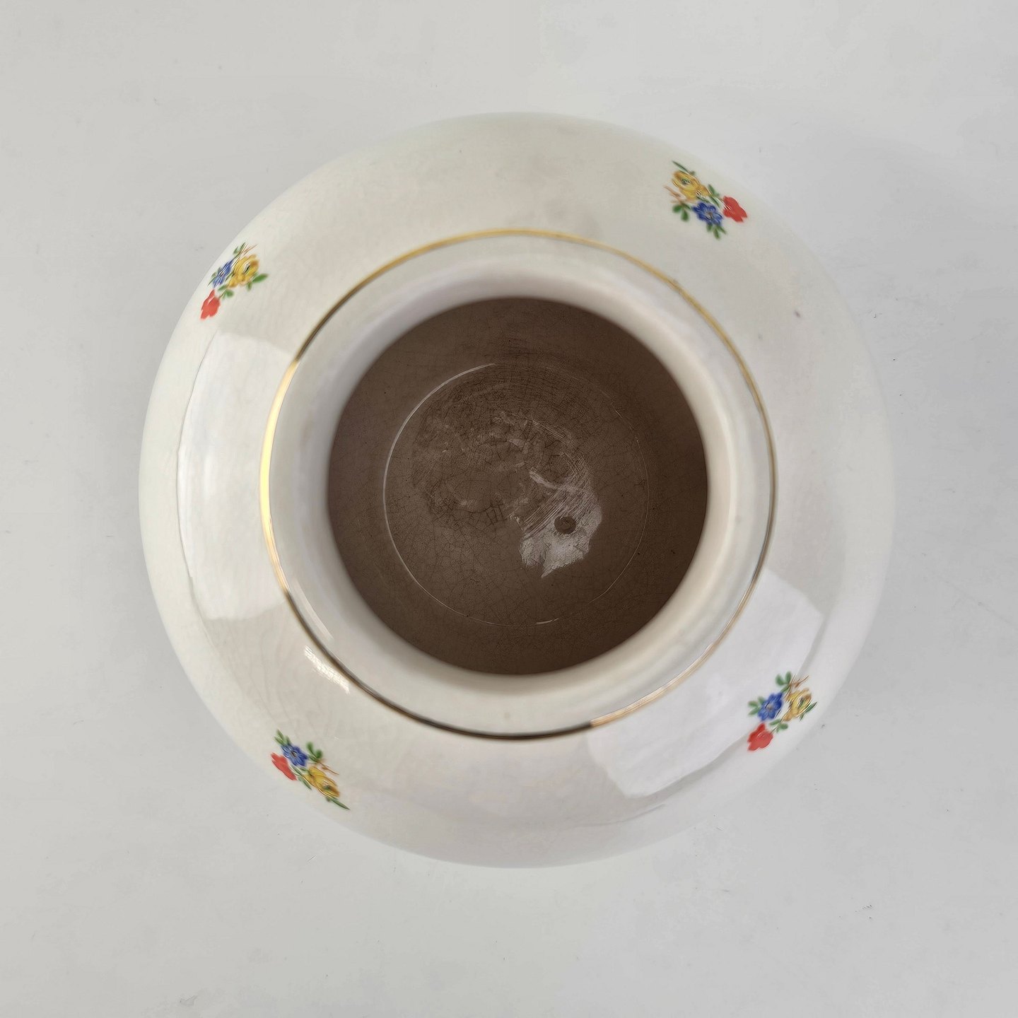 Beskrivelse: Rund vase i hvid fajance med blomsterdekoration og guldkant