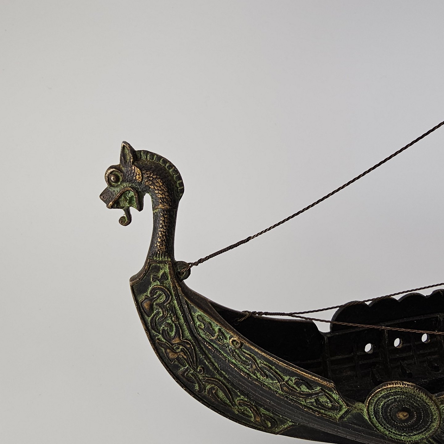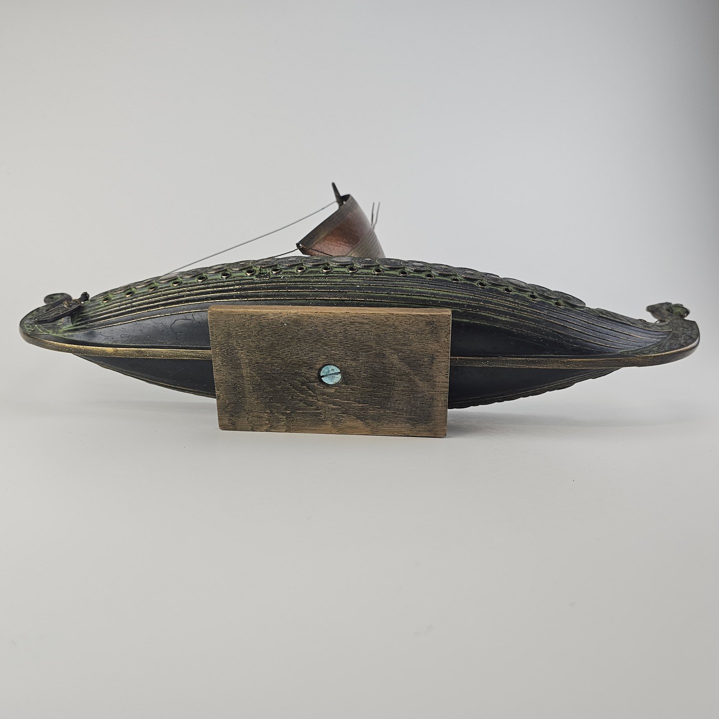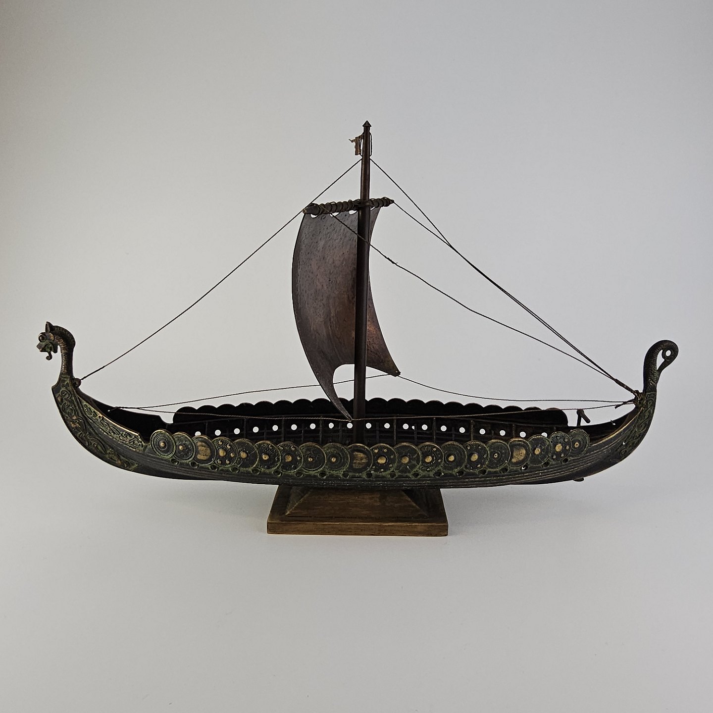 Beskrivelse: Miniature replika af et dansk vikingeskib lavet i bronze med træfod