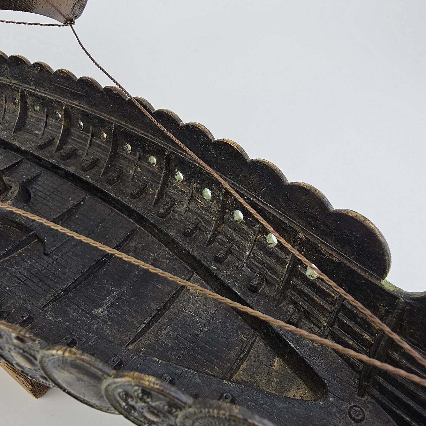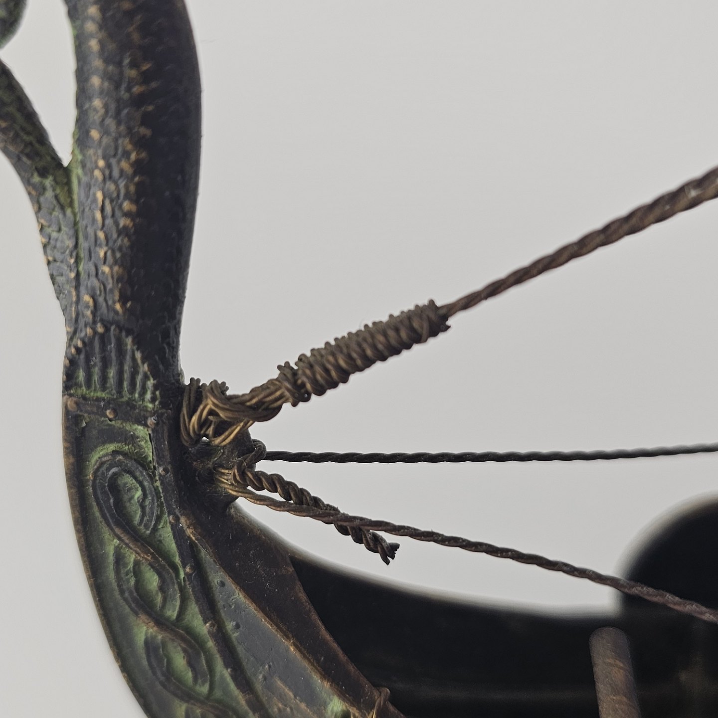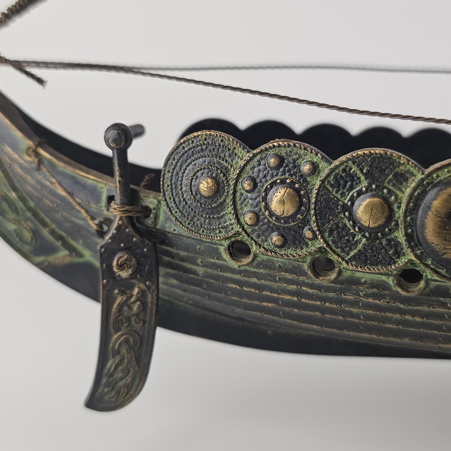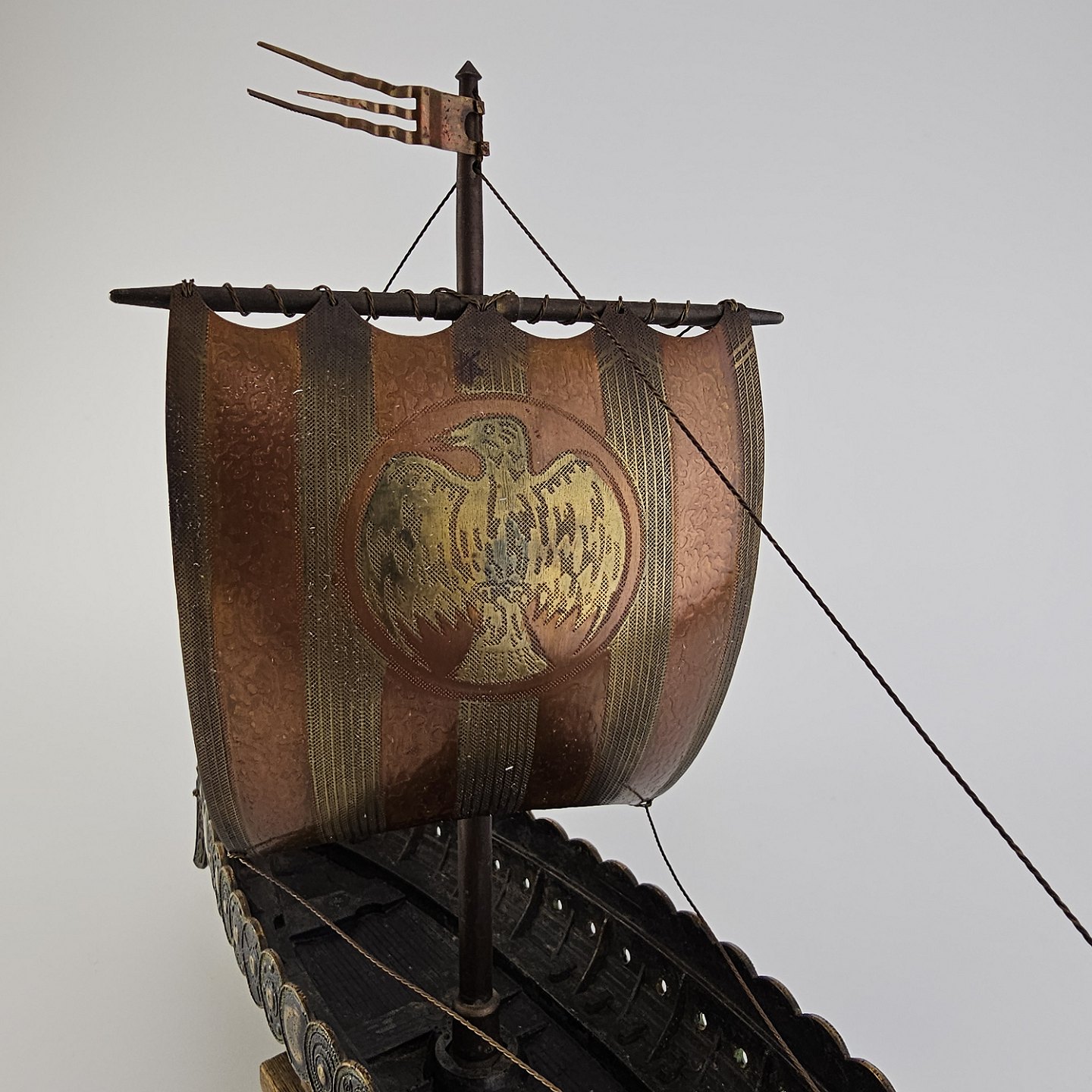 Beskrivelse: Miniature replika af et dansk vikingeskib lavet i bronze med træfod
