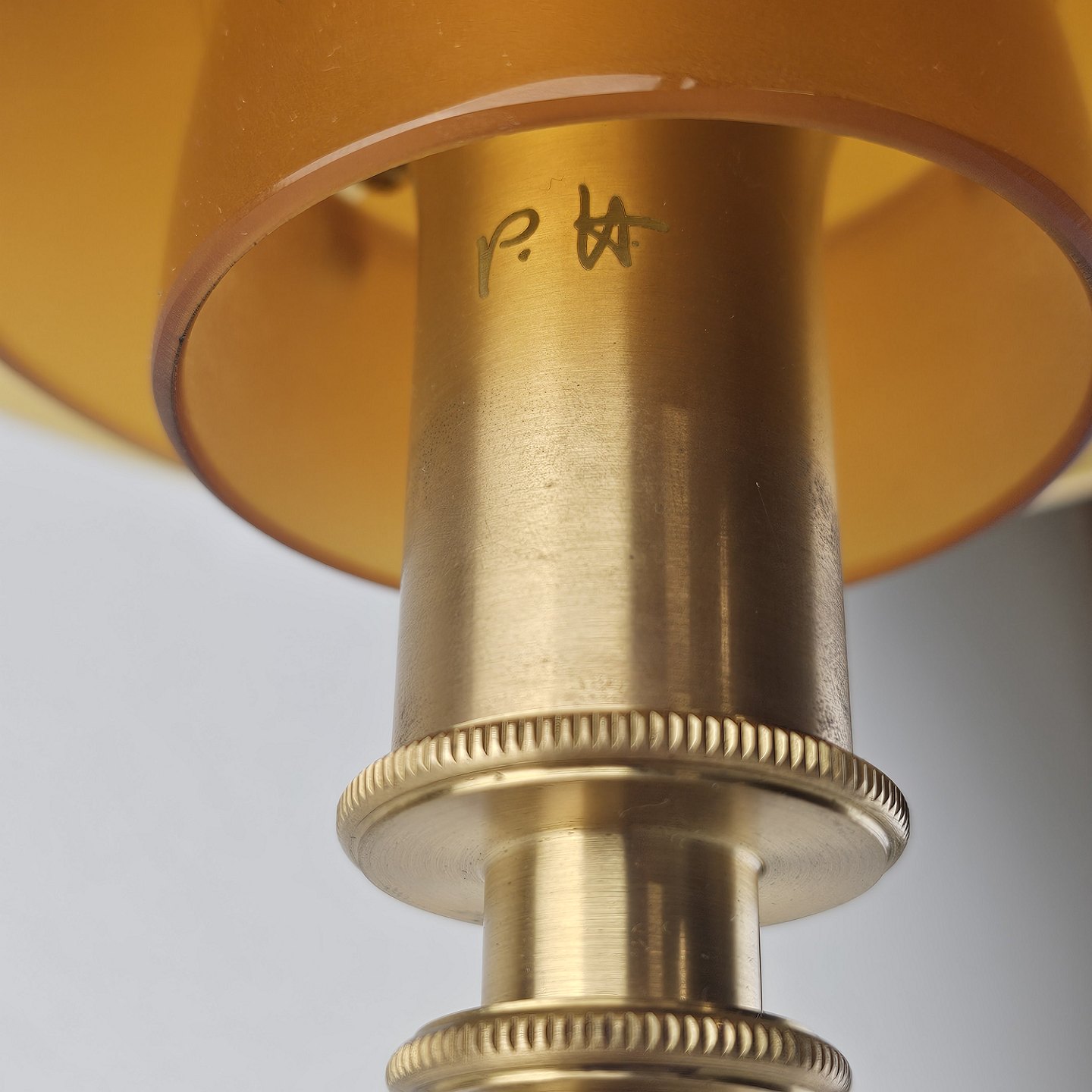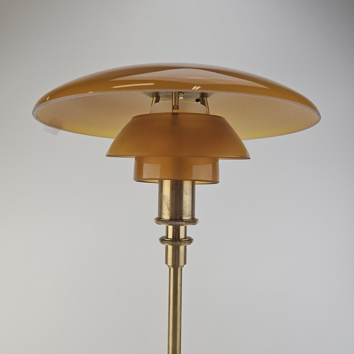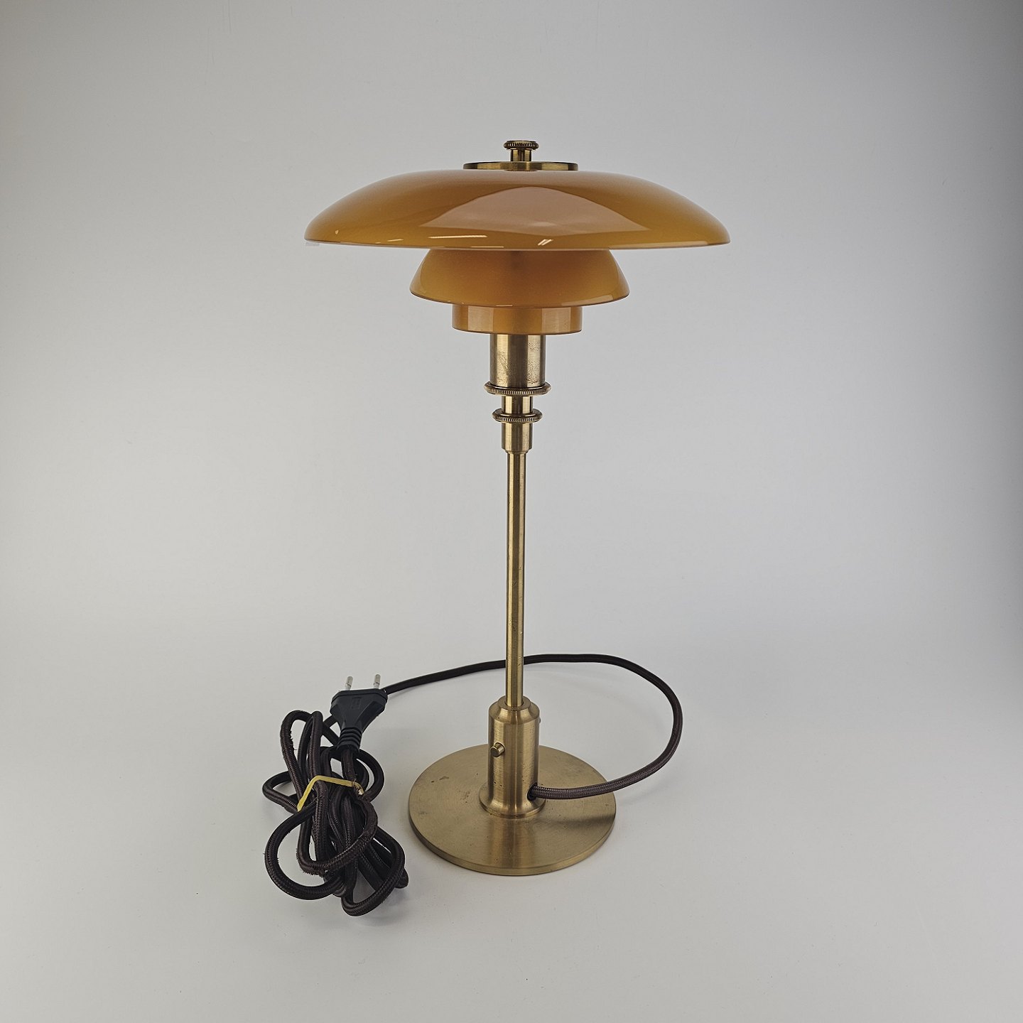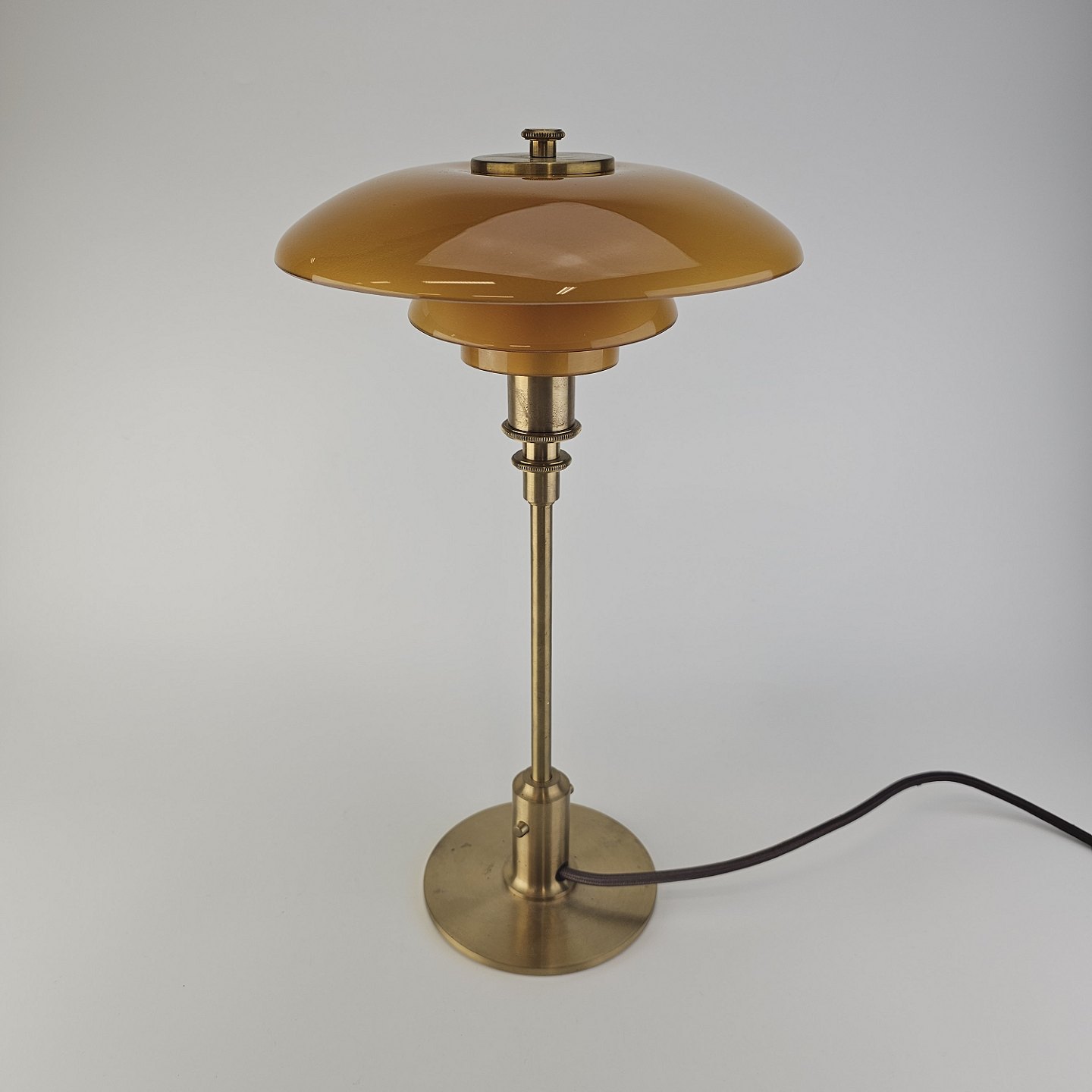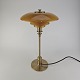 Beskrivelse: Bordlampe PH 3/2 med skærm af mundblæst ravfarvet etlagsglas og fod af strøgslebet messing