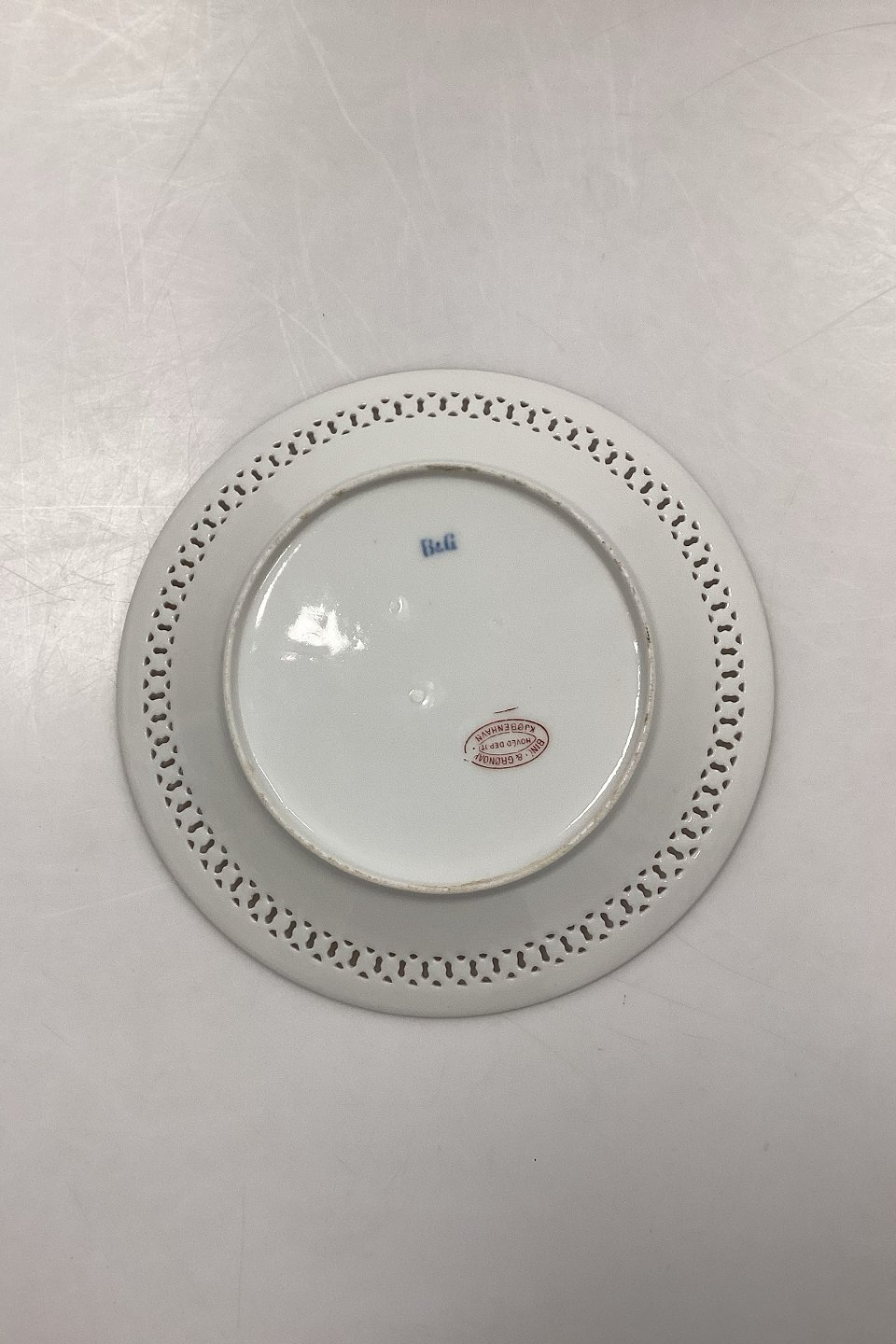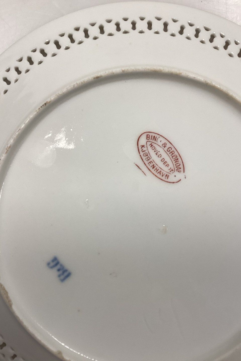 Beskrivelse: Bing og Grøndahl Art Nouveau tallerken med gennembrudt kant og Hoveddepot mærke