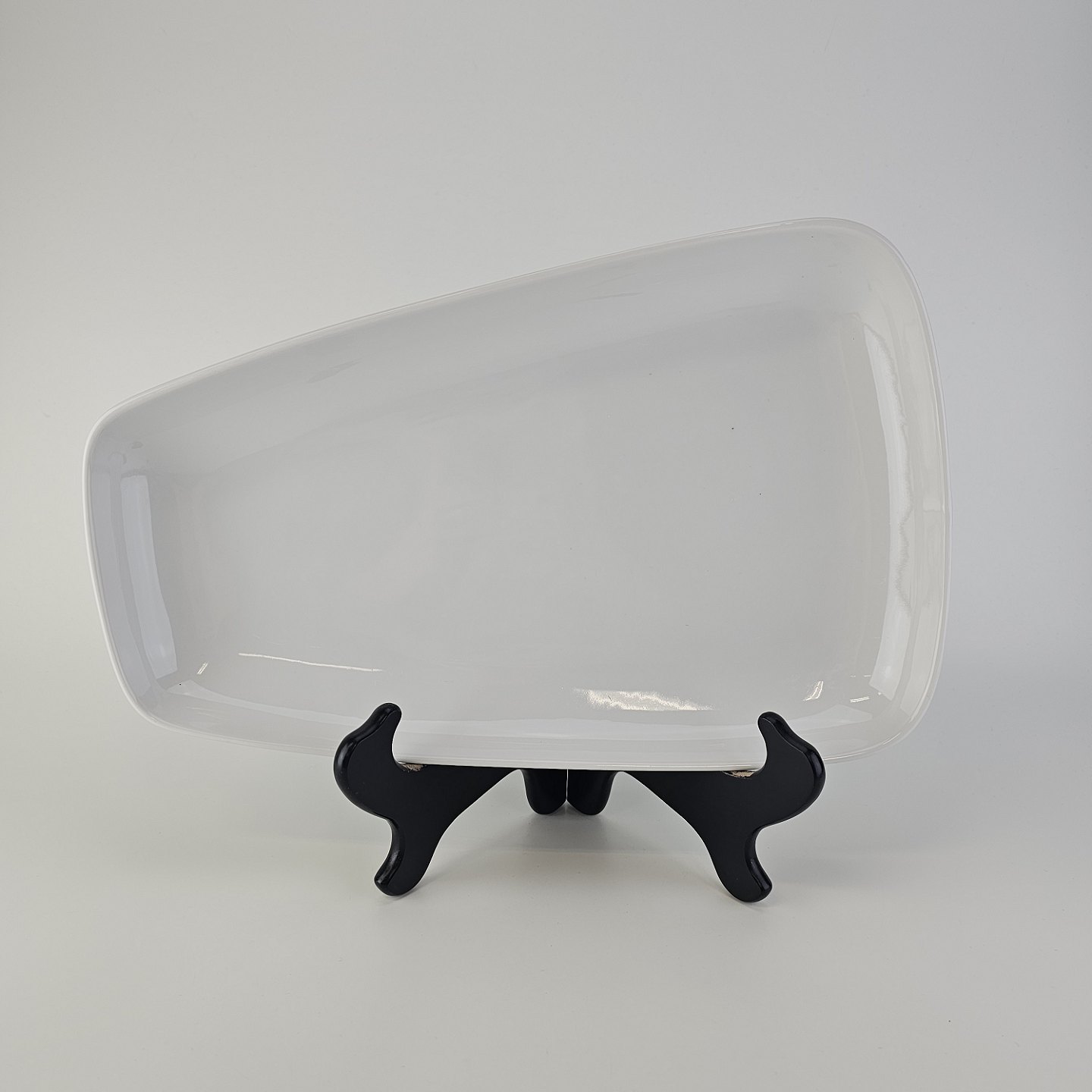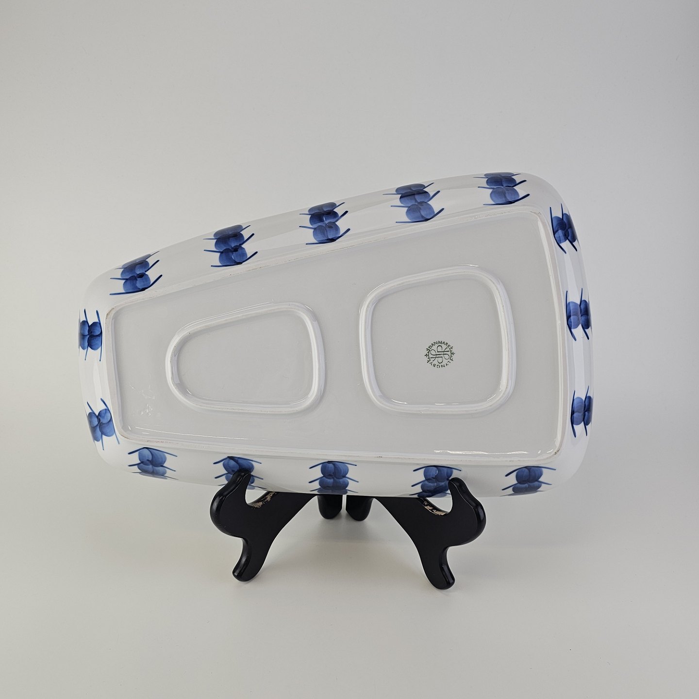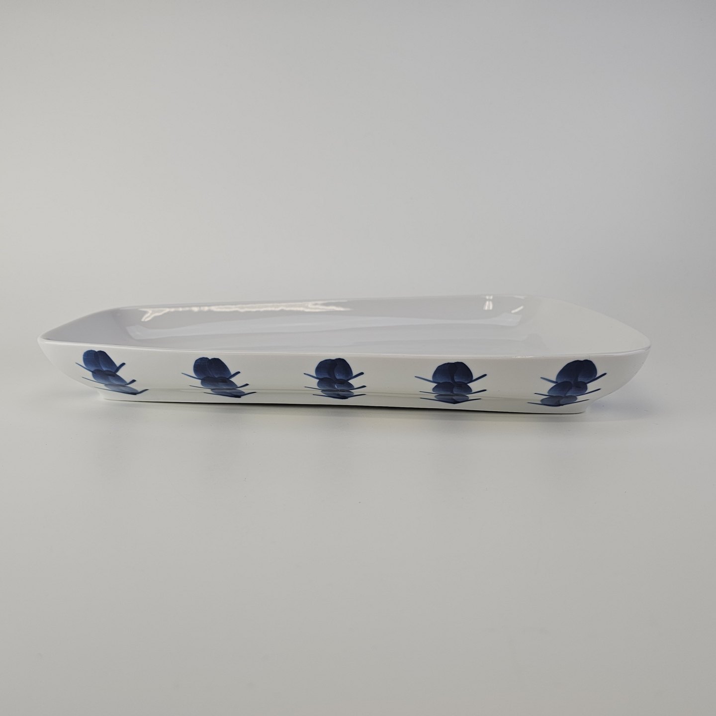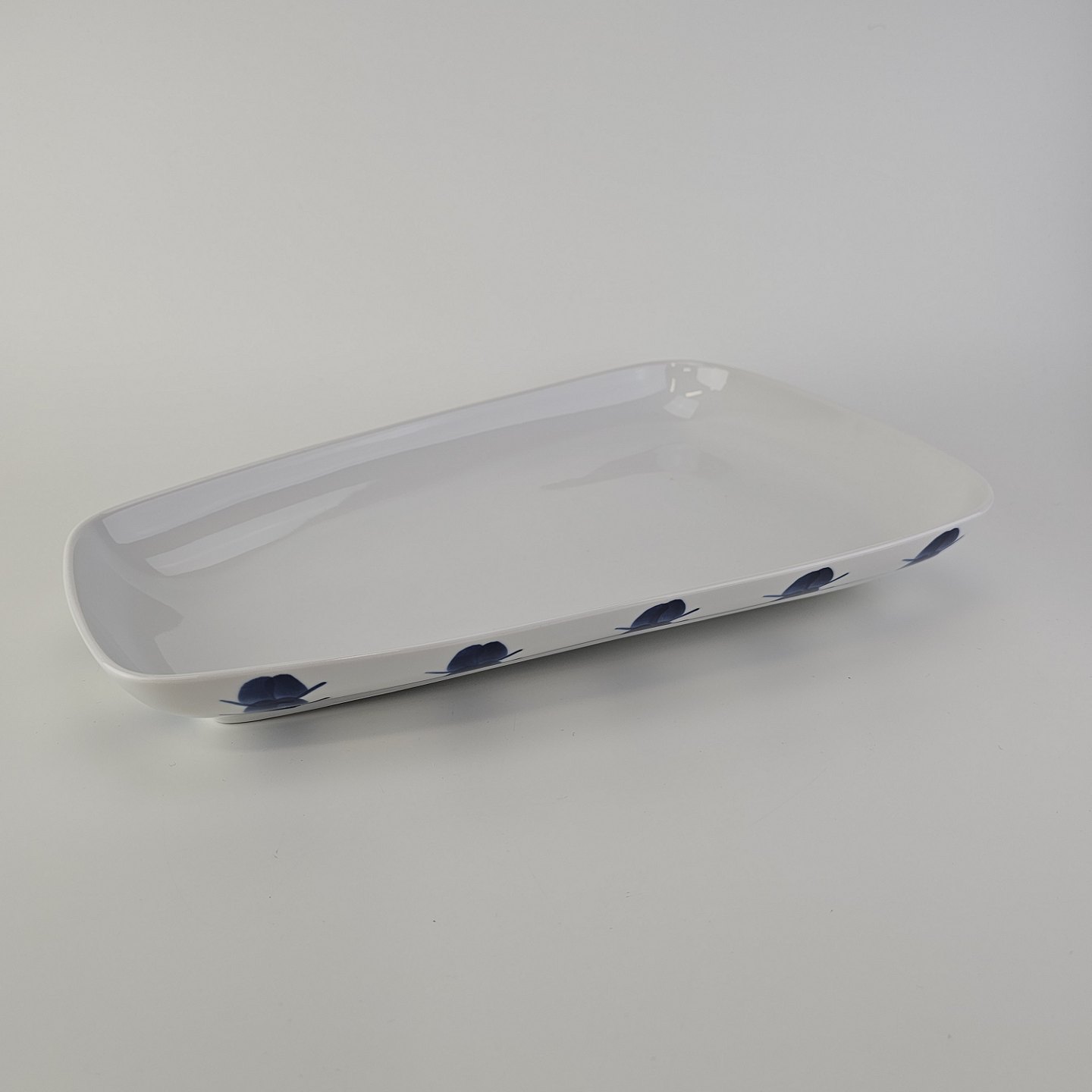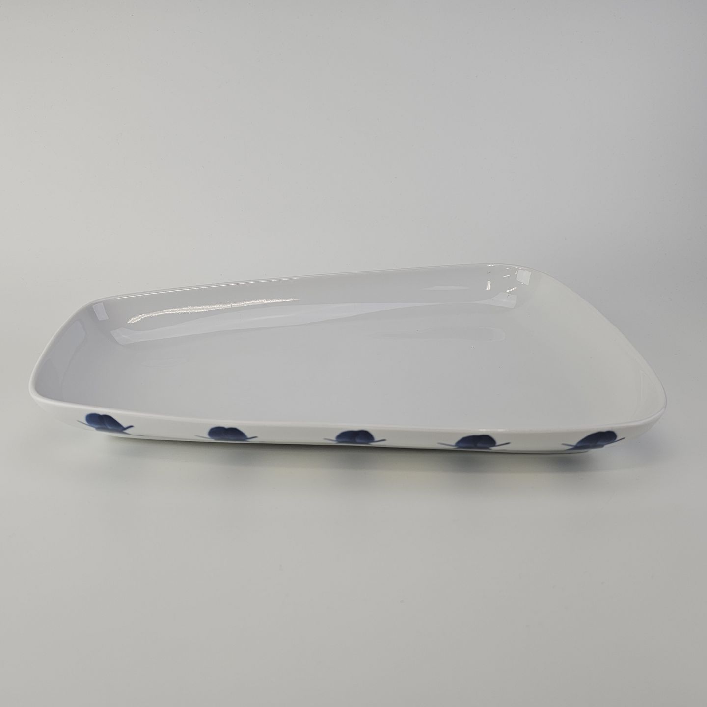 Beskrivelse: Asymmetrisk aflangt fad i porcelæn fra Stellet Danild 30, også kaldet Blomsterknop