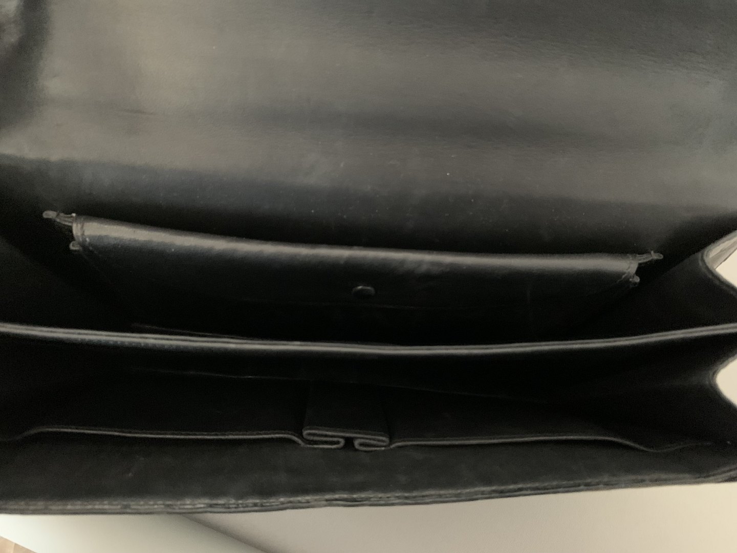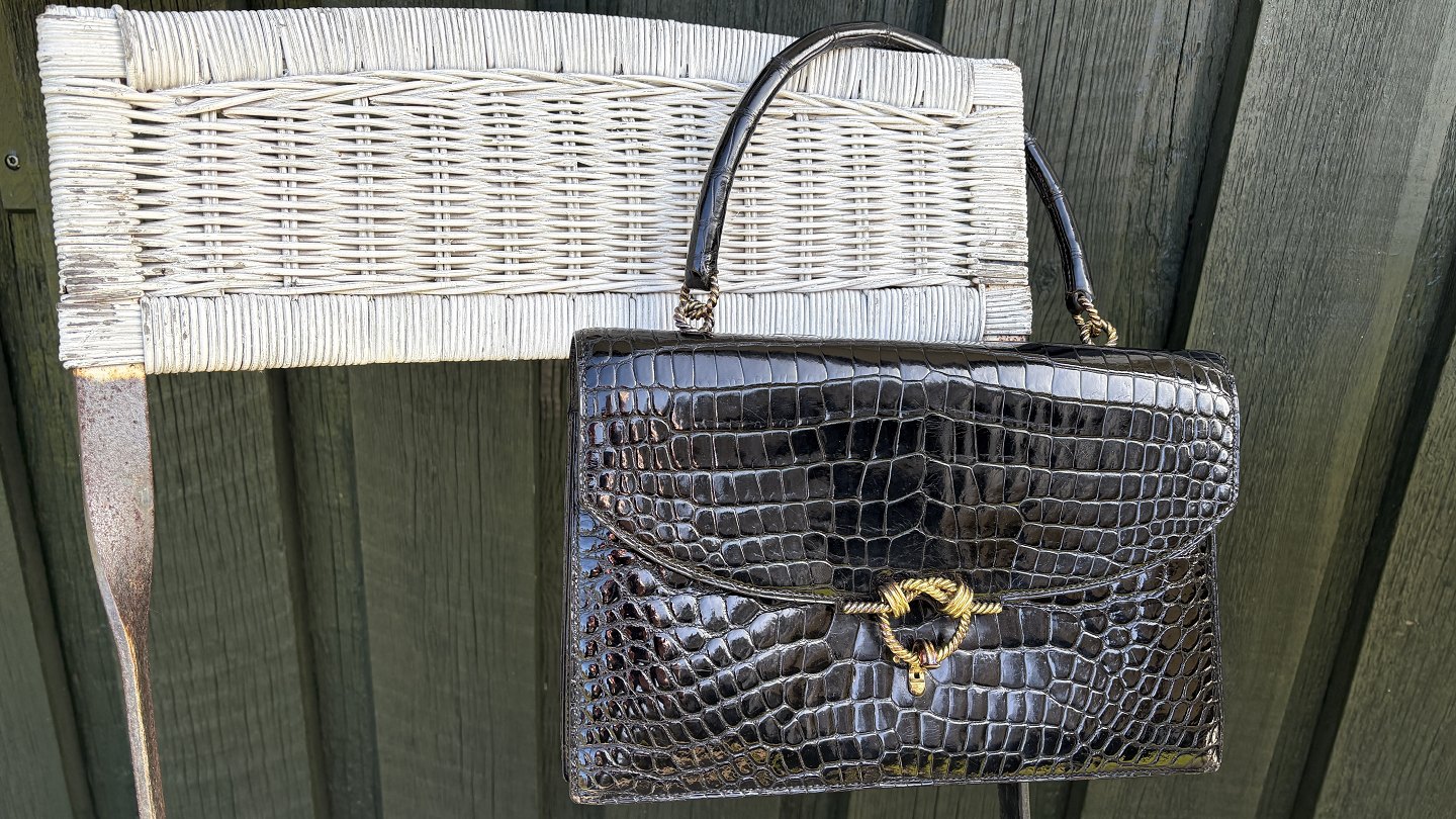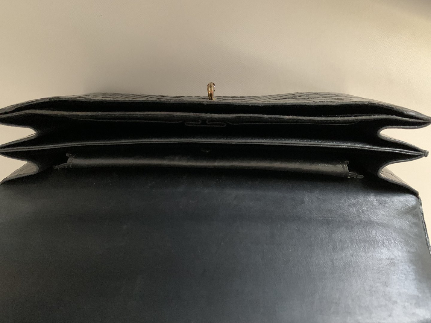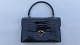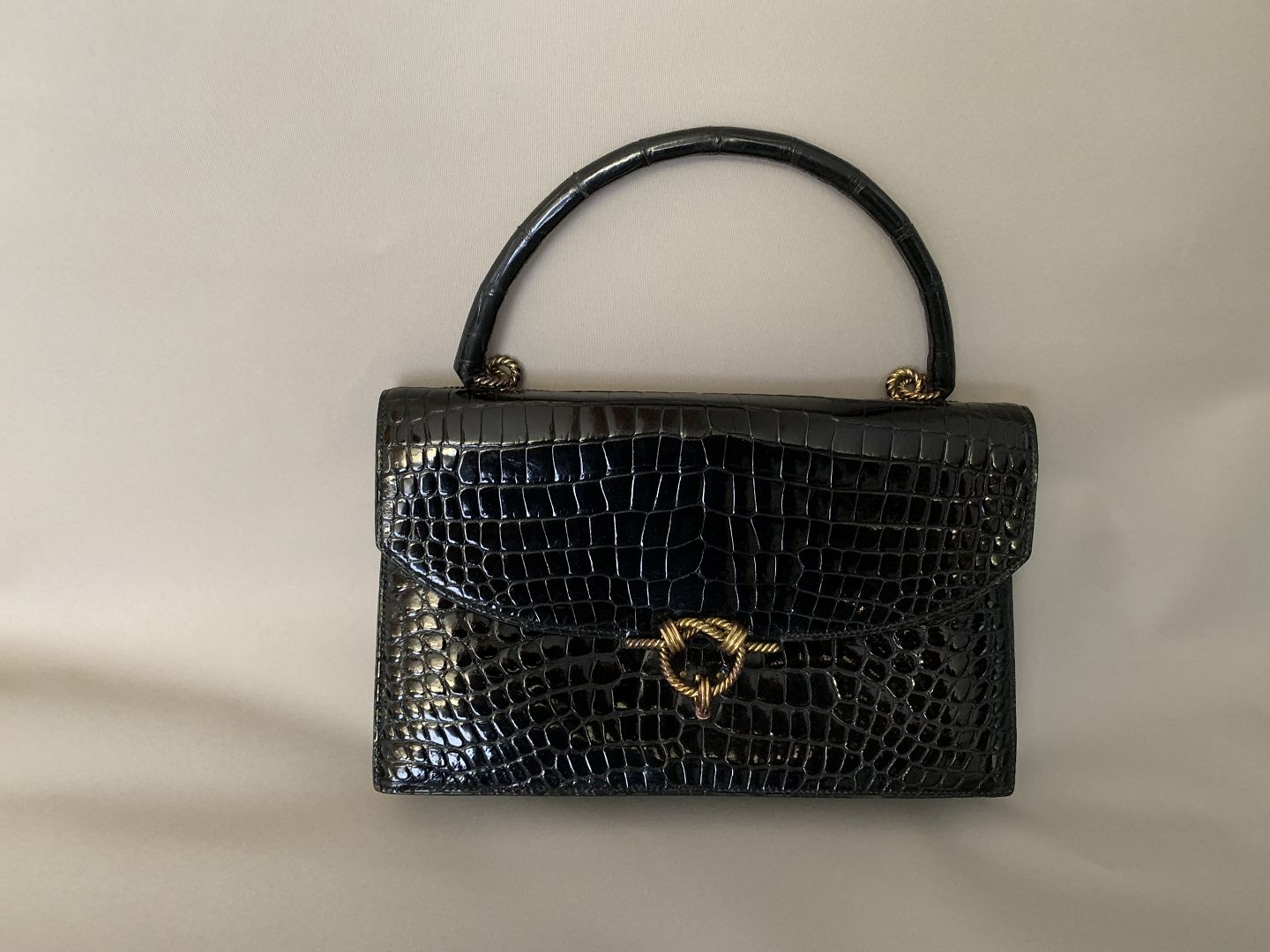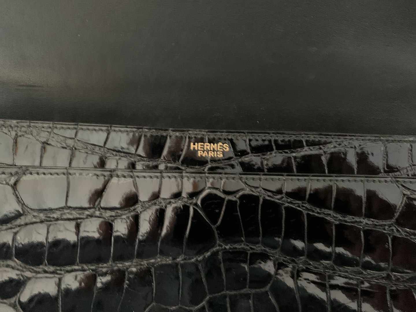 Beskrivelse: Hermès - Krokodilleskinds taske fra 1970erne. med fast hank og forgyldte beslag.