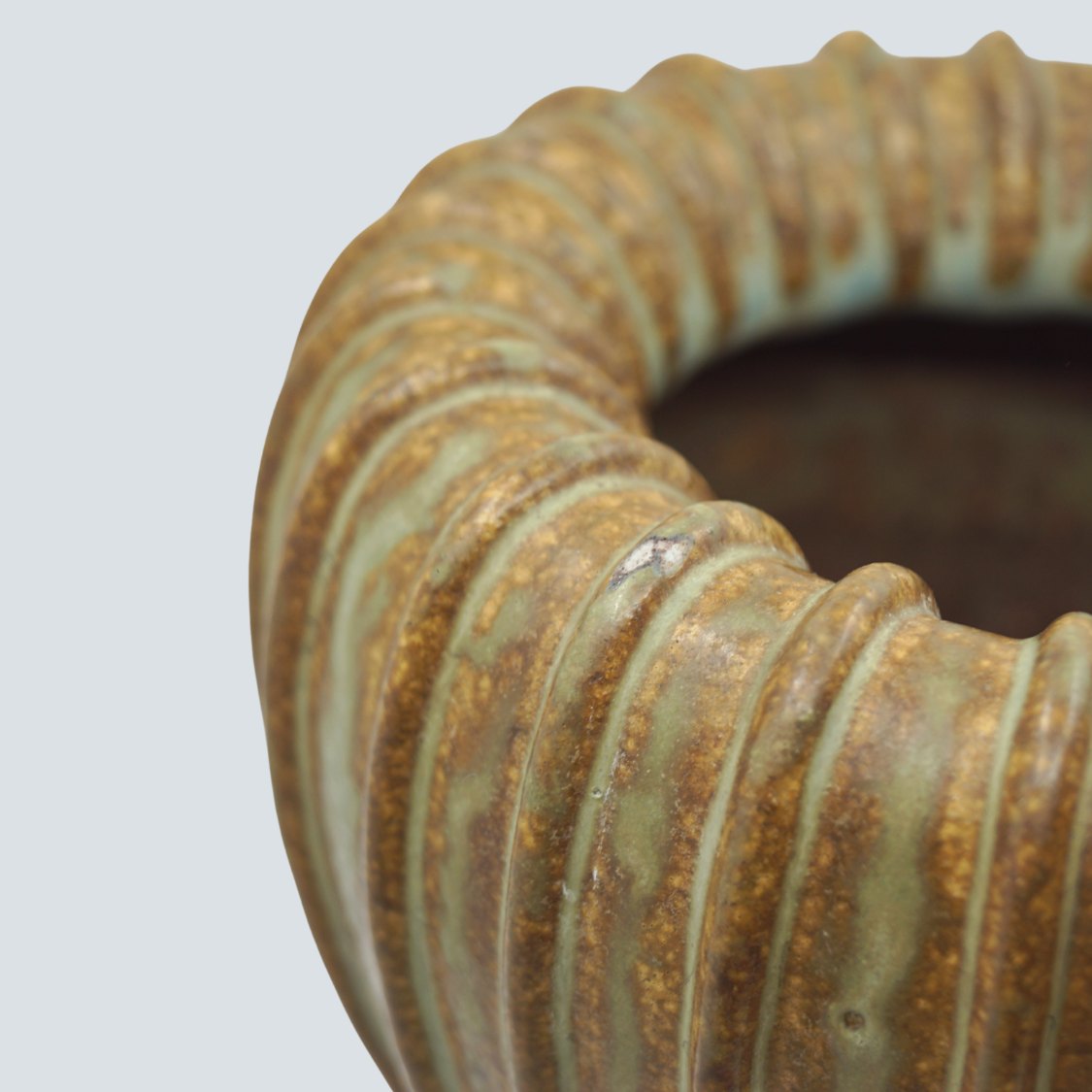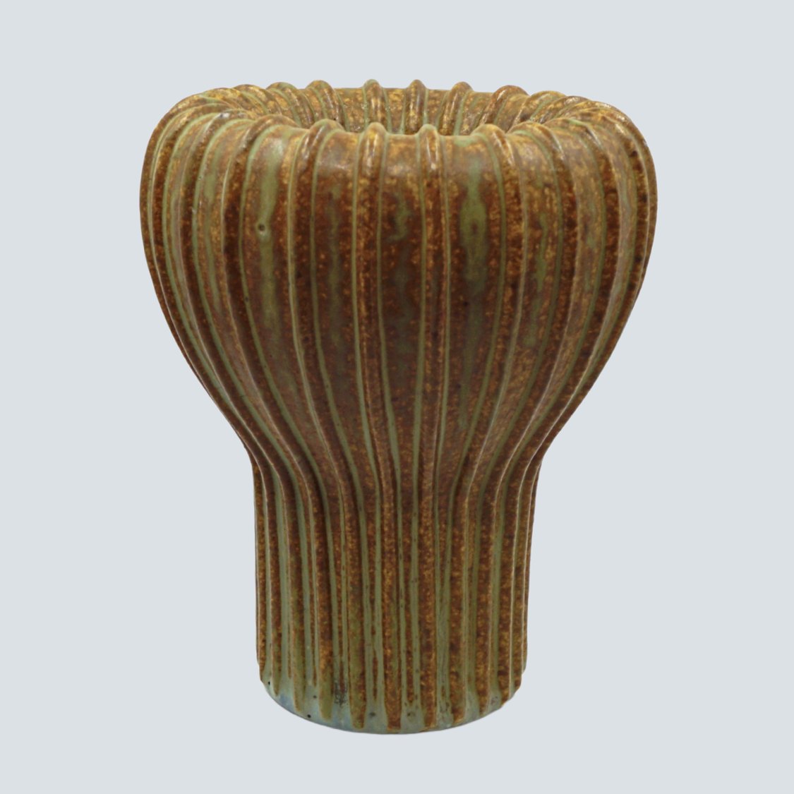 Beskrivelse: Arne Bang; Riflet vase af stentøj, nr. 139 Dekoreret med grønblå og brun glasur.