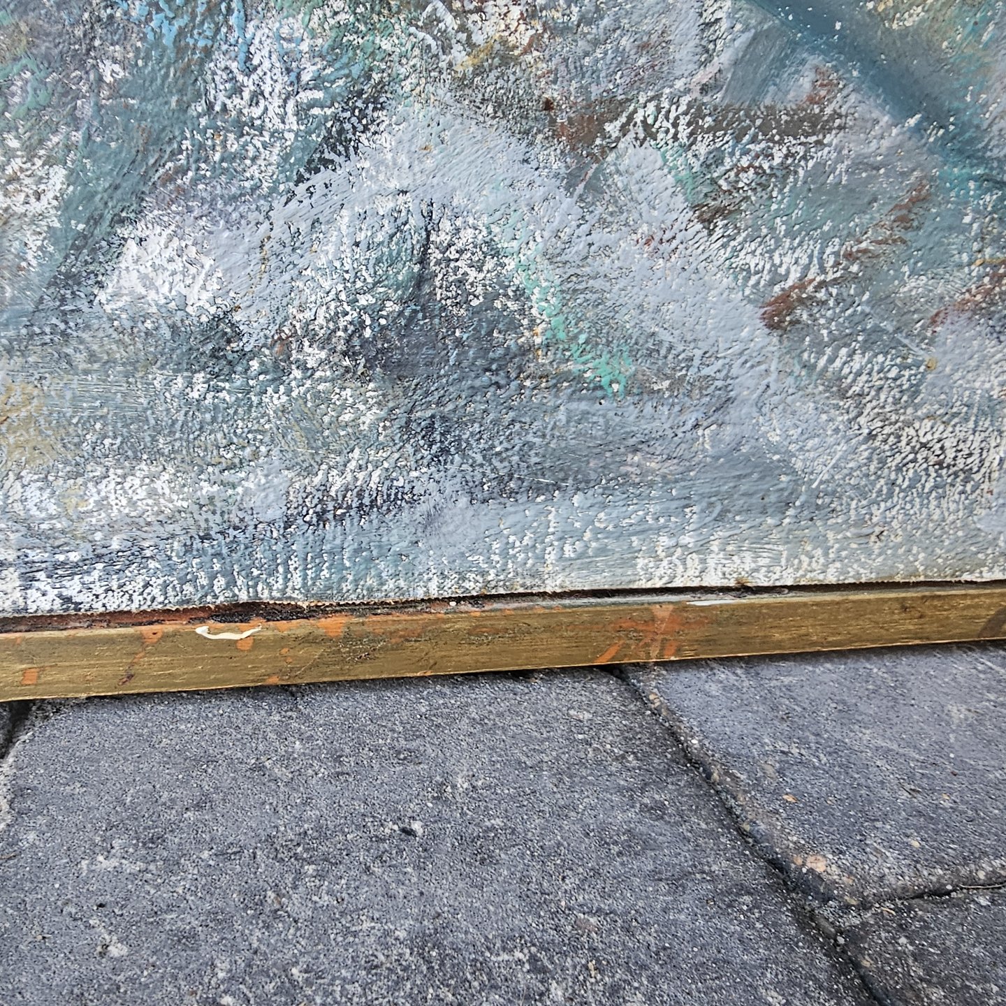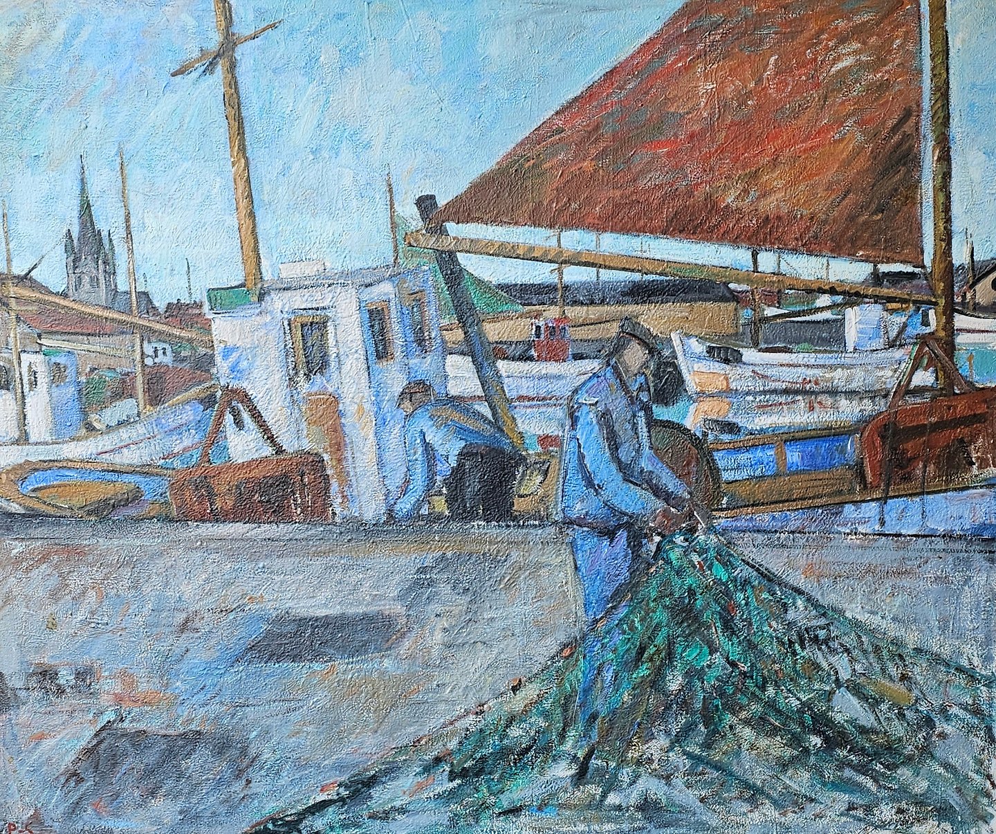 Beskrivelse: Oliemaleri på plade monteret i guldmalet ramme med motiv af en fisker på havnen i Frederikshavn