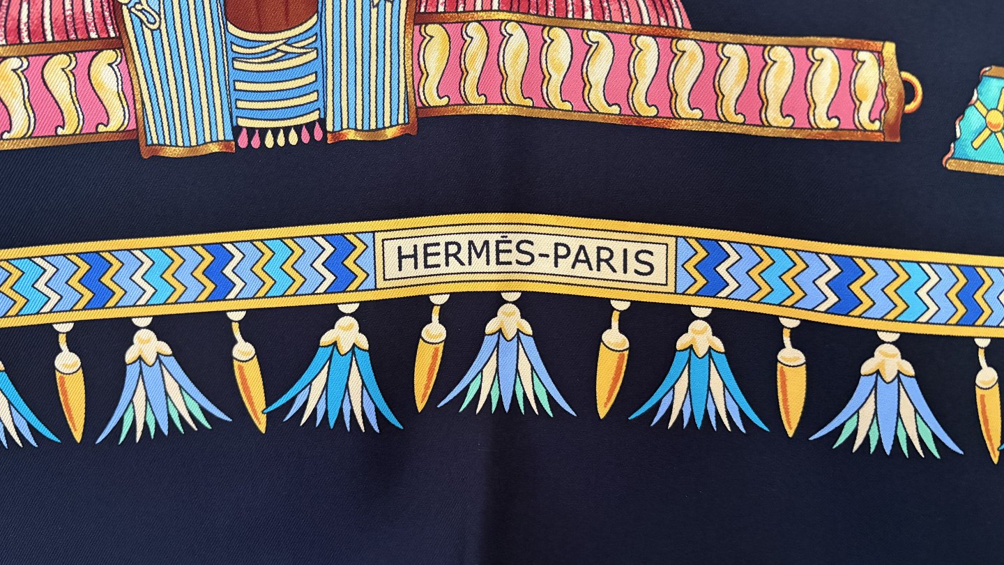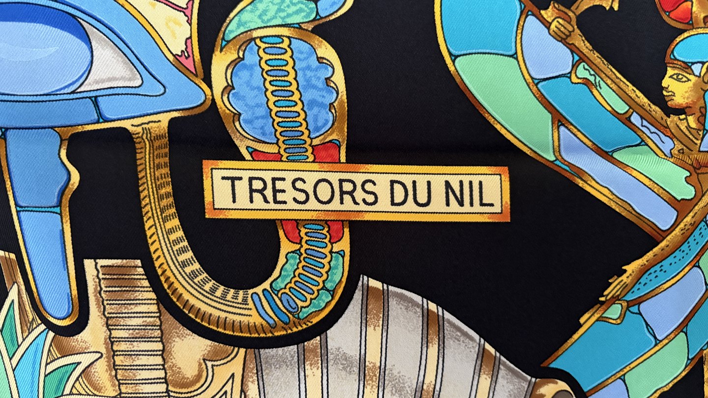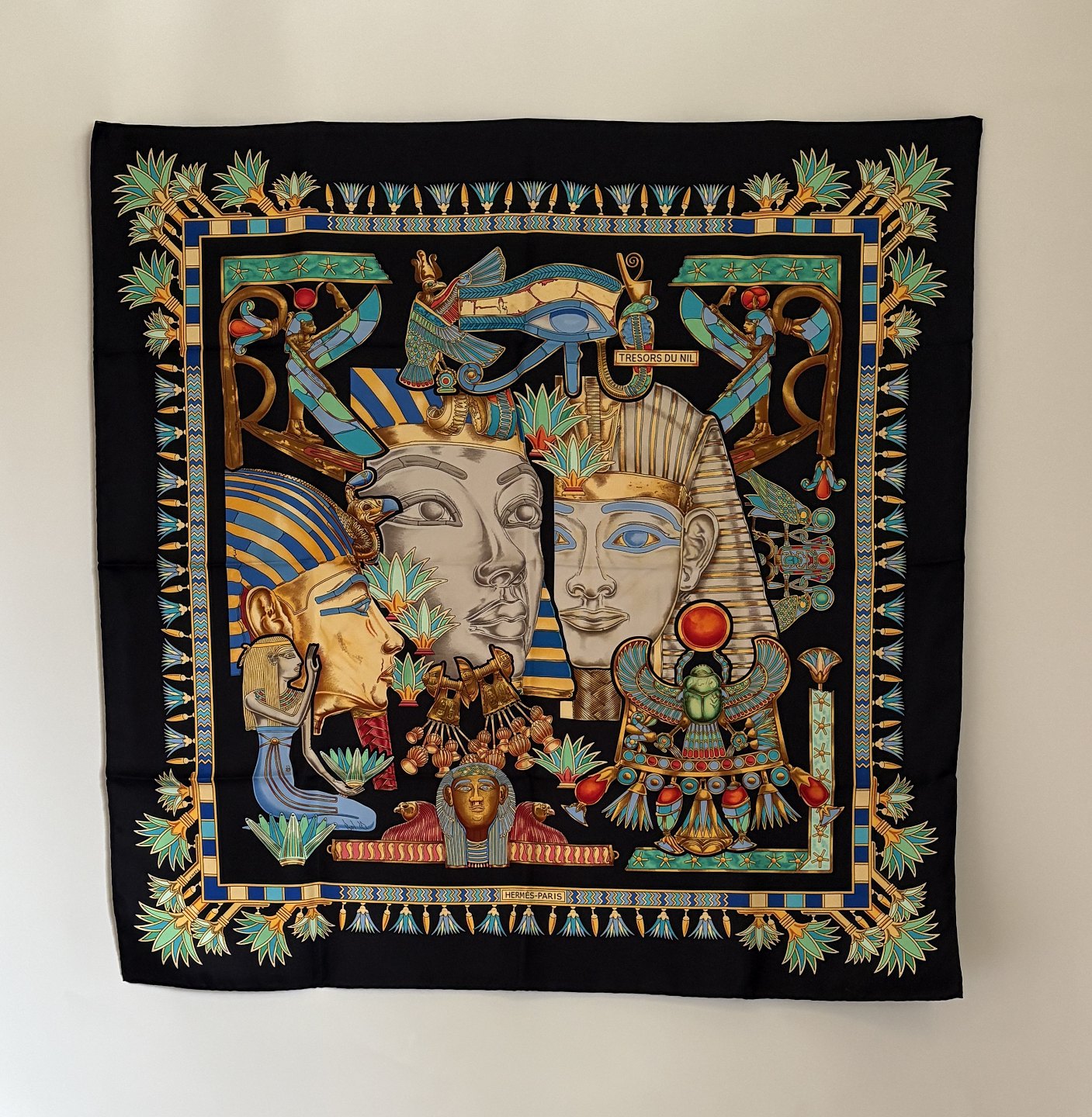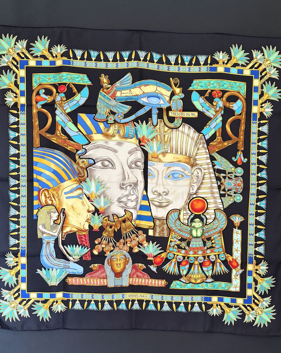 Beskrivelse: Hermès: Sort silketørklæde med motiv 'Tresors Du Nil'.