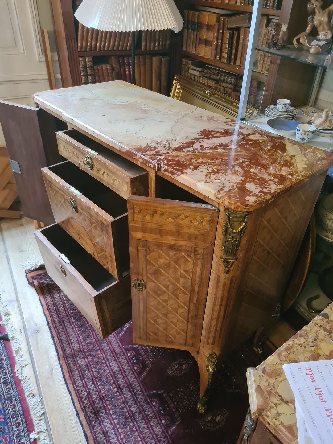Beskrivelse: Kommode fra sidst i 1800 tallet. Fremstillet i rokokostil med låger og løstliggende marmorplade på toppen. Fremstår pæn og velholdt uden de store brugsspor.