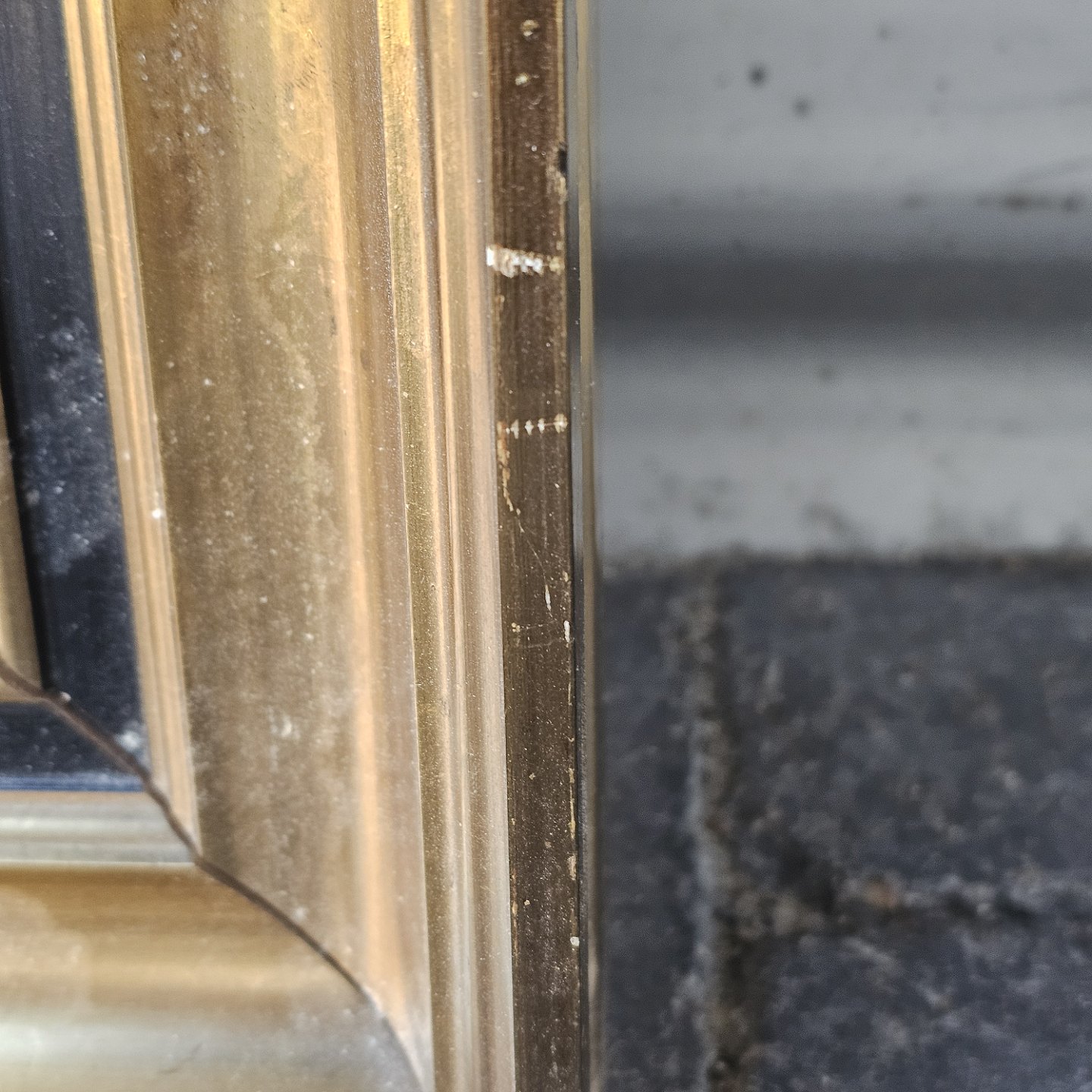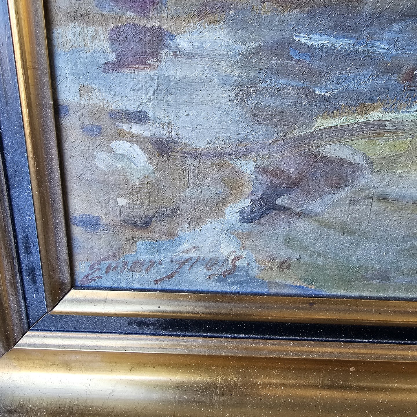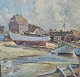 Beskrivelse: Oliemaleri på lærred monteret i guldramme med motiv af skibe på en strand