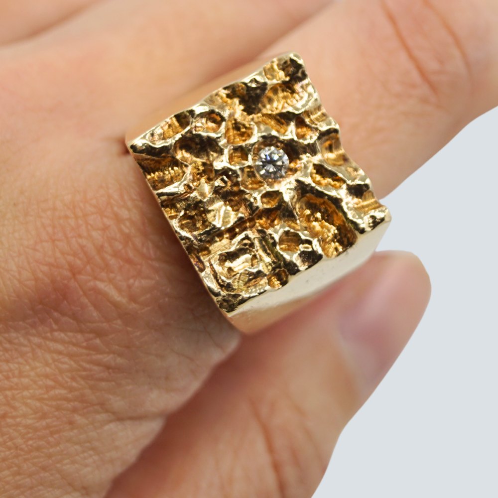 Beskrivelse: Ejvind Sørensen; Stor signetring i 14 kt. guld med diamant, ca. 0.10 ct. Kraftig kvalitet. Vægt: 50 gram.