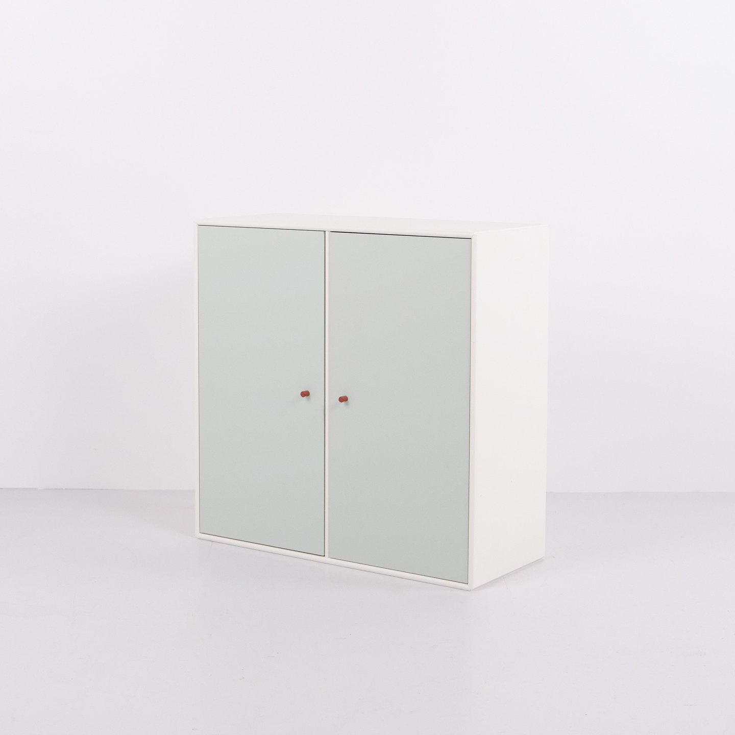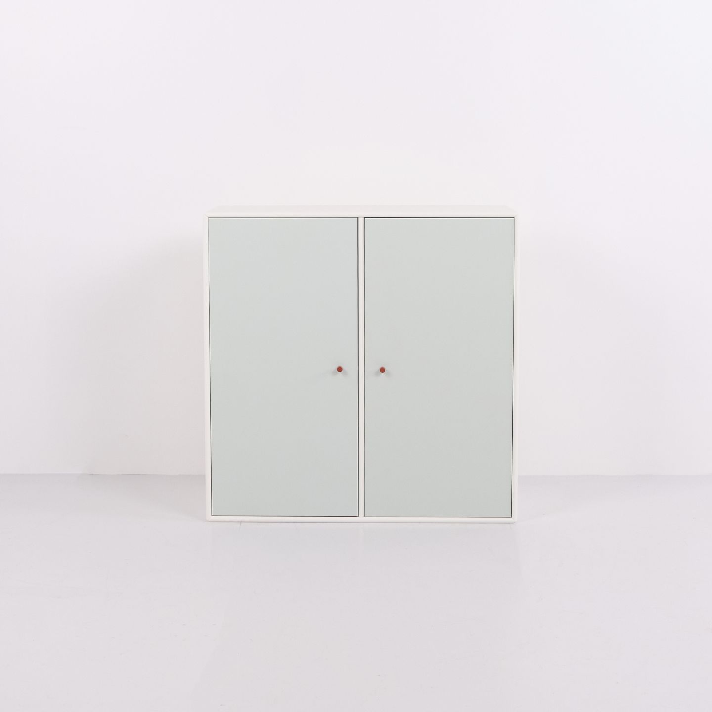 Beskrivelse: Montana skabmodul fra det modulære Montana System designet af Peter J. Lassen. Udført i lakeret MDF med hvid korpus, to mintgrønne låger og brune greb. Montana blev grundlagt i 1982 og er kendt for fleksible opbevaringsmoduler produceret i Danmark. Modellen kan anvendes som vægskab, entrémøbel, badeværelsesskab eller del af større Montana reolsystem. Montana fremstilles fortsat på Fyn og er kendt for høj finish samt stort farveudvalg.