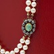 Beskrivelse: Dobbeltradet perlekæde trukket med knuder mellem perlerne. Smykkelås af 14 kt. hvidguld og guld, prydet med diamanter og smaragd.