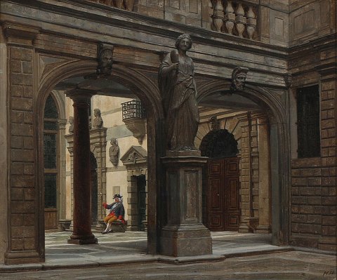 "Sydlandsk havneparti i måneskin" Olie maleri på plade.
