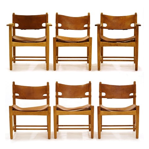 Børge Mogensen Jagtspisebordsstol 3237 & 3238. Sæt på seks spisestuestole i patineret eg og kernelæder. To stole med armlæn. Pæn stand. Én stol med reparation på læderstropper under sædet.