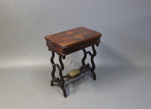 Lille antikt sybord i palisander med drejefunktion og fine detaljer.