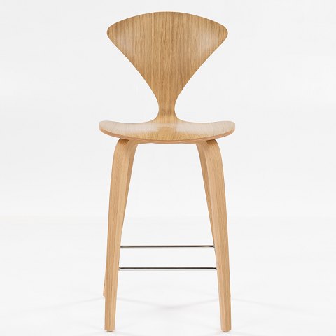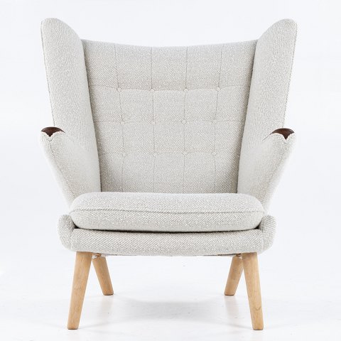Lænestol i bejdset birketræ med ryg og sæde i lyst uldbetræk.