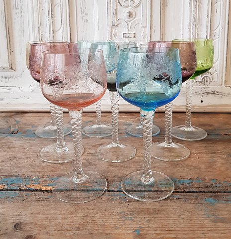 Et sæt på tre bryllupsglas. Stilk med hvid spiral og kumme med forgyldte inskriptioner: "Anders S Spellmann Anna L Datter 1794". Fremstillet på Hurdal Glasværk, Norge. H: 15cm