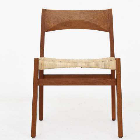 Sæt a 6 spisestole i patineret eg og nyt sjeneflet. Præsenteret på Snedkerlaugets Møbeludstilling i 1962.