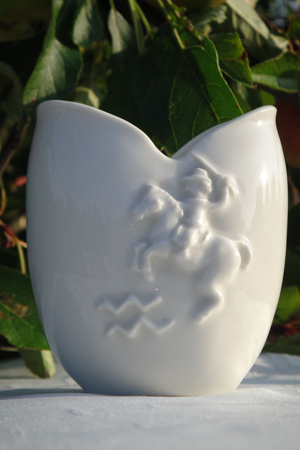 Beskrivelse: Lille prydvaseanvendelig til vintergæk og påske Royal Copenhagen porcelæn vase. Kgl. Blanc de Chine vase med motiv i relief af kong Volmer til hest, nr. 20497. Højde 9cm. 1. Sortering, fin hel stand. Kunstner Bode Willumsen.