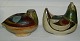 Beskrivelse: Due og høne i keramik af Julie Høm. Begge figurer fremstår i perfekt stand. Duen er 9 1/2 cm høj og 141/2 cm lang. Hønen er 13 cm høj og 14 cm lang. Kunstnersignatur JH på bunden.