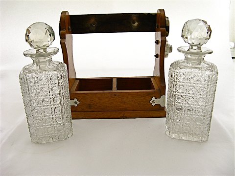 Beskrivelse: 1800-tals engelsk tantalus 2 slebne karafler i en egetræs kasse med forsølvede beslag længde 25 cm. højde 30 cm.