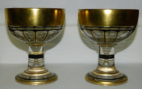 Beskrivelse: Par champagneglas med gulddekoration. Muligvist fra Böhmen ca. 1900. I god stand uden skader eller reparationer. 13 cm høj og 10½ cm i åbningsdiameter
