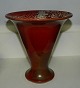 Beskrivelse: Trompetformet vase i keramik fra Kähler-fabrikken i Næstved. Ca. 1920. Dækket af en rød lustre-glasur, herunder naturligt krakeleret. I perfekt stand. Fabriksmærket på bunden med HAK DENMARK. 17½ cm høj.