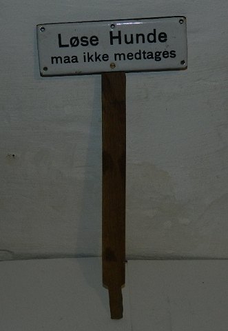 Beskrivelse: Dansk skilt i emalje med teksten: Løse Hunde maa ikke medtages. Skiltet er i perfekt stand. Sidder på en flad, lang pind i træ. Har siddet i jorden ved et området hunde ikke havde adgang ! Skiltet måler 5 cm x 15 cm. 33 cm høj incl. pind.