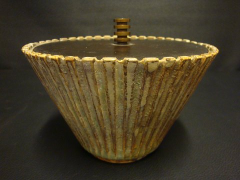Beskrivelse: Arne Bang lågkrukke af keramik med vertikale rifler. Låg i bronze. Sign. AB 119. 9cm høj og 14cm i diameter. i Flot stand.