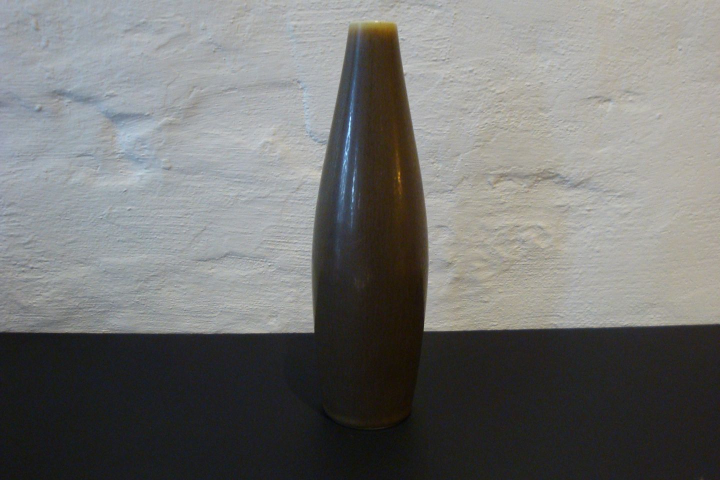 Beskrivelse: Palshus vase i mørkgylden farve.