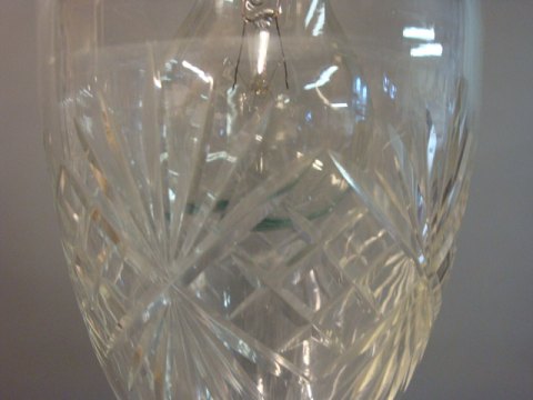 Beskrivelse: Glas pendel i jugendstil fra ca år 1920 med bruneret messing top og 2 m hvid stof ledning.