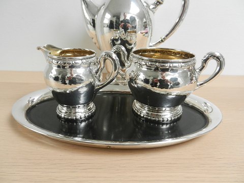 Beskrivelse: Smukt kaffeservice i hammerslået sølv bestående af kaffekande, sukkerskål, flødekande og bakke med sølv kant og bund af bakelit.