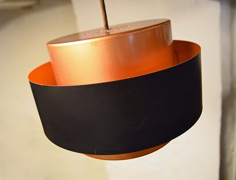 Beskrivelse: Kobberlampe model Saturn, designet af Jo hammerborg og produceret af Fog og Mørup i 1966. Pendel lampen er udformet af kobber og sortlakeret metal. Den er velholdt. Højde: 18 cm. Ø: 30 cm.
