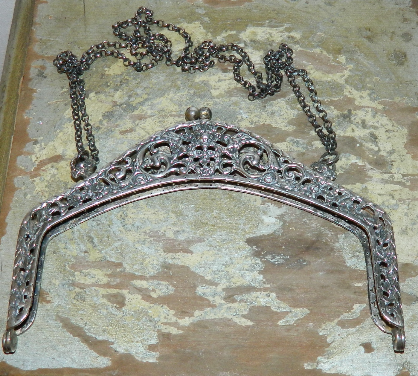 Beskrivelse: Beslag til taske i sølv. Kunne muligvis også bruges til sølvramme ! Ingen skader eller reparationer. Sølvstemplet 800. Slået sammen er den 12½ cm høj og 17½ cm lang.