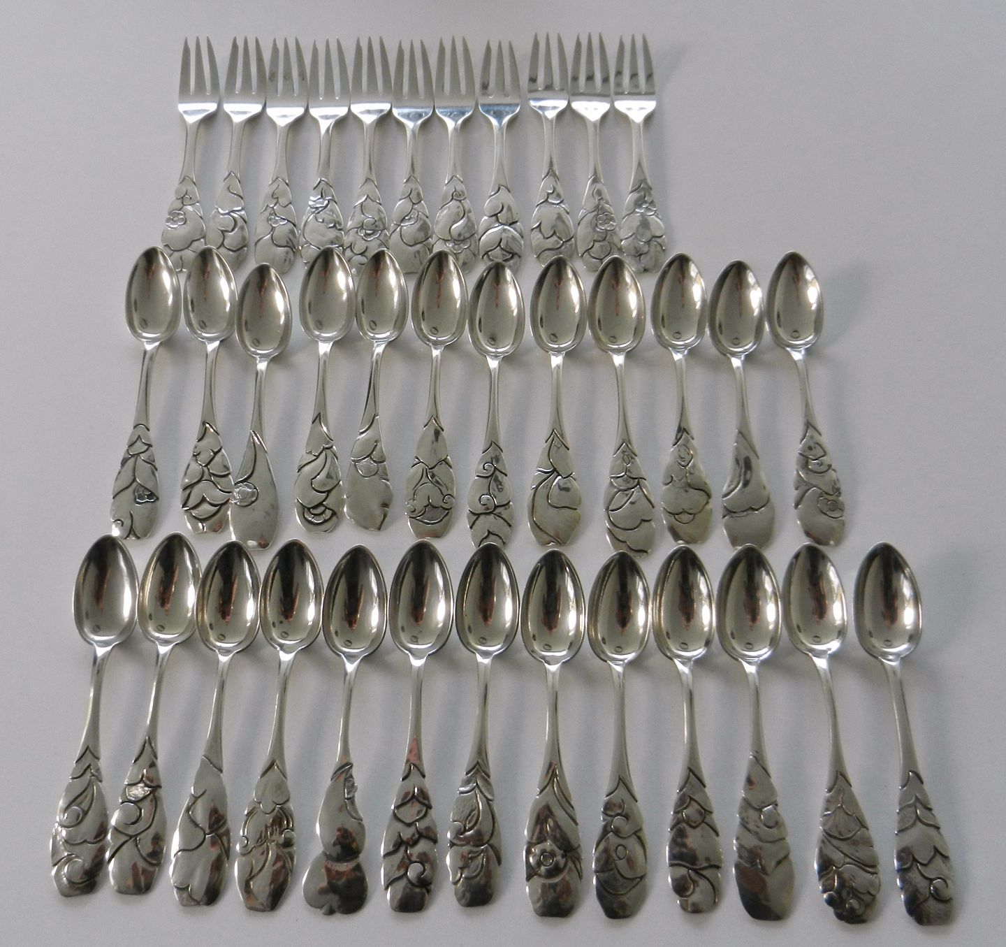 Beskrivelse: Thorvald Bindesbøll skønvirke teskeer og kagegafler udført af Holger kyster & Jørgen Krogh.