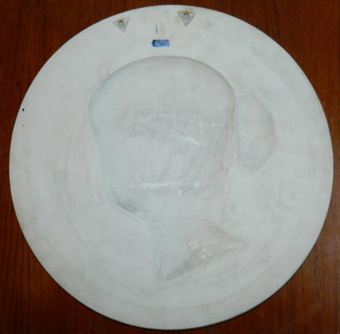 Beskrivelse: Platte i bisquit med portræt af ung ubekendt kvinde af billedhuggeren N. G. Henriksen (1855-1922) for Royal Copenhagen. Midt i 1880´erne skabte NGH flere af disse platter og andre arbejder i bisquit for Royal Copenahgen. Ofte er motiverne hentet fra arkiverne på Thorvaldsen´s museum hvorfor dette portræt også tilskrives den store mester Bertel Thorvaldsen. Platten fremstår i perfekt stand uden skader eller reparationer. Signeret af NGH samt produktionsåret 1884 på den unge kvindes hals. På bagsiden fabriksmærket med Royal Copenhagens velkendte mærke - "De tre bølger". Platten er 2½ cm høj og 36 cm i diameter.