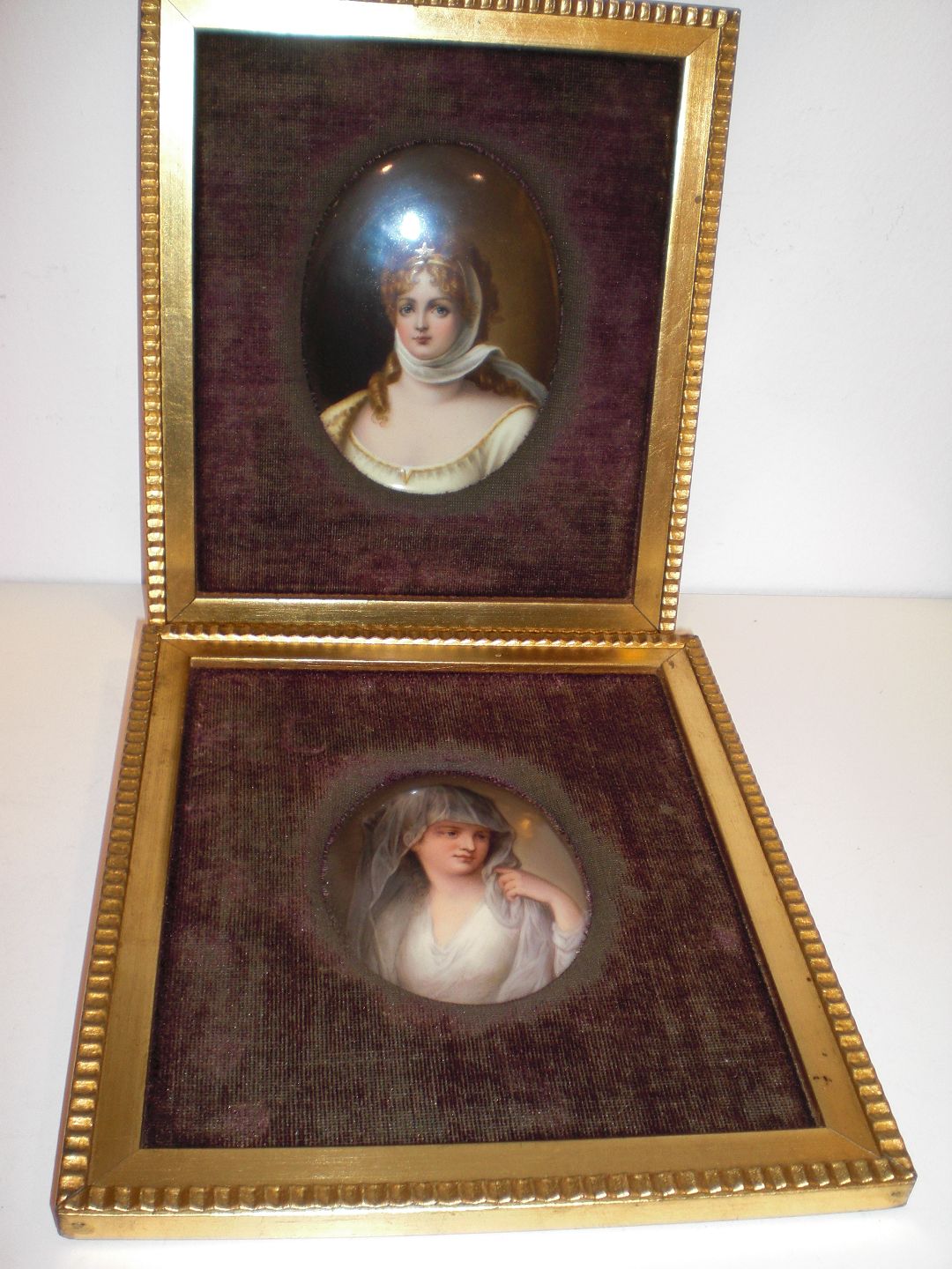 Beskrivelse: 2 miniatureportrætter malet på porcelæn af unge kvinder fra 1900-århundrede. Indrammet i fløjl og med udskåret forgyldt træramme. Mål på selve portrættet 10 x 7,5 cm. Ukendt kunstner og ukendt oprindelse.