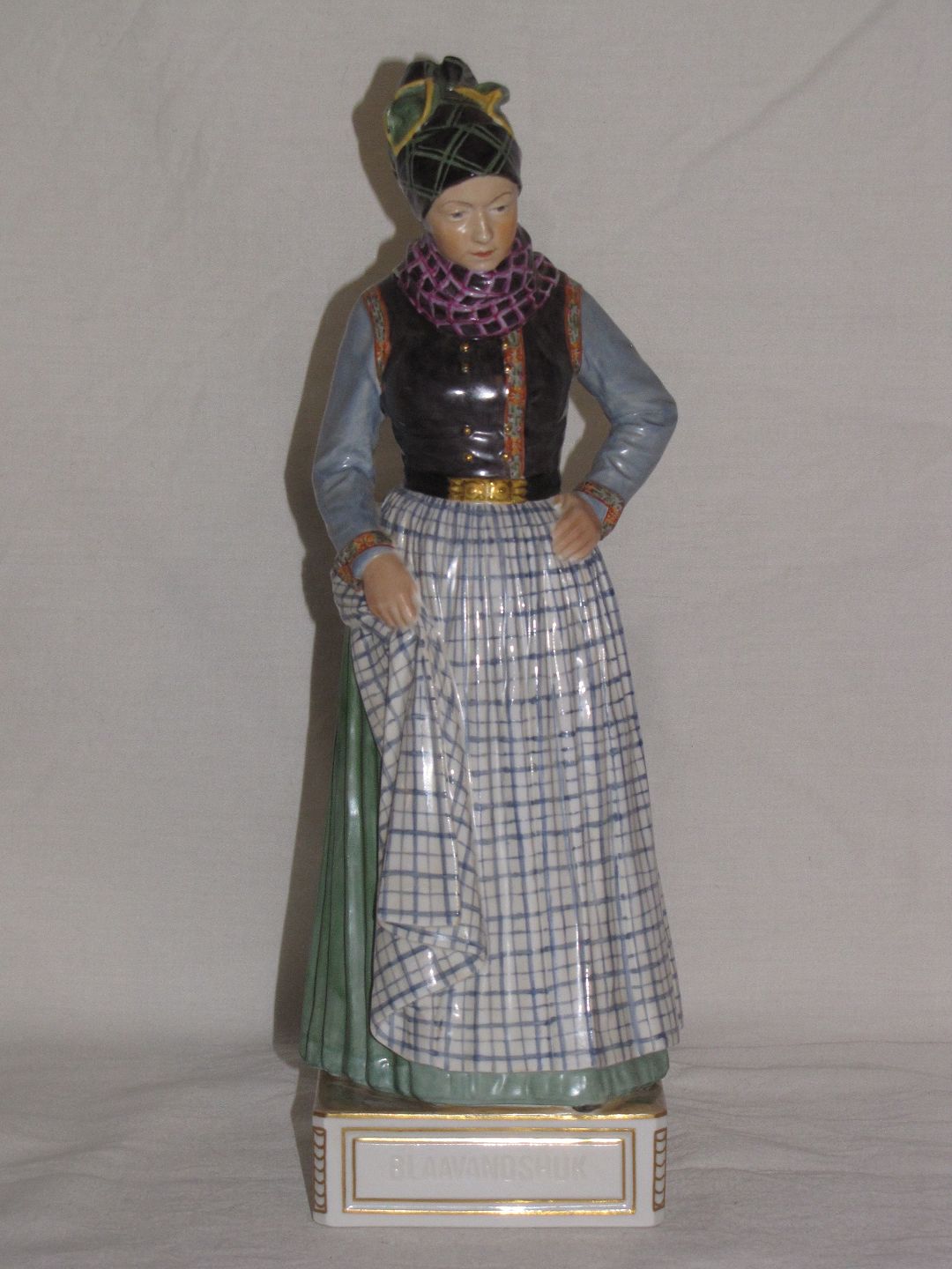 Description: Figure no. 12138 Woman in national dress Blaavandshuk artist Carl Martin-Hansen for Royal Copenhagen, Juliane Marie stamp overglaze, polychrome decorations and gold. 1. Sortering